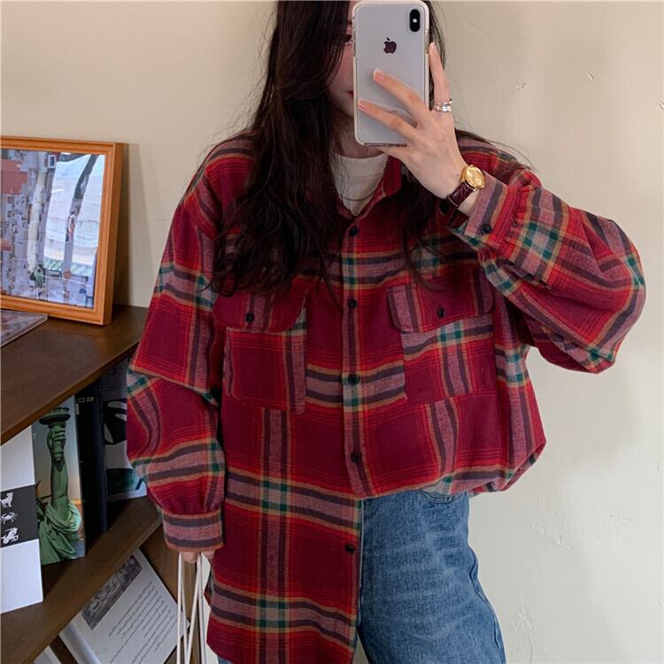 スプリングルーズシャツ レディーススタンダード格子柄 ロング レトロ 春物 試着室8201506810