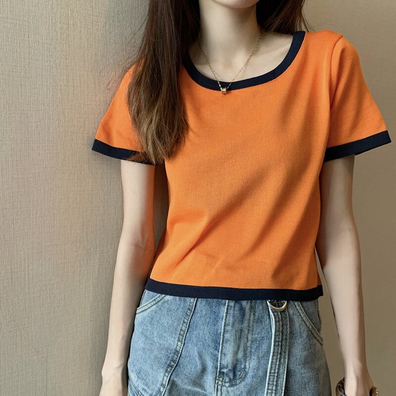 ブラックシャツ スプリングスタイルショートトップス ニットTシャツ レディース 春物 試着室13192855904