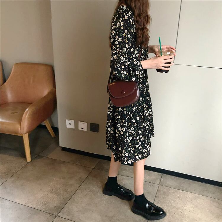 スプリングフローラルスカート ルーズ薄手スタンダードVネックドレス レトロ 春物 花柄 試着室11643642258