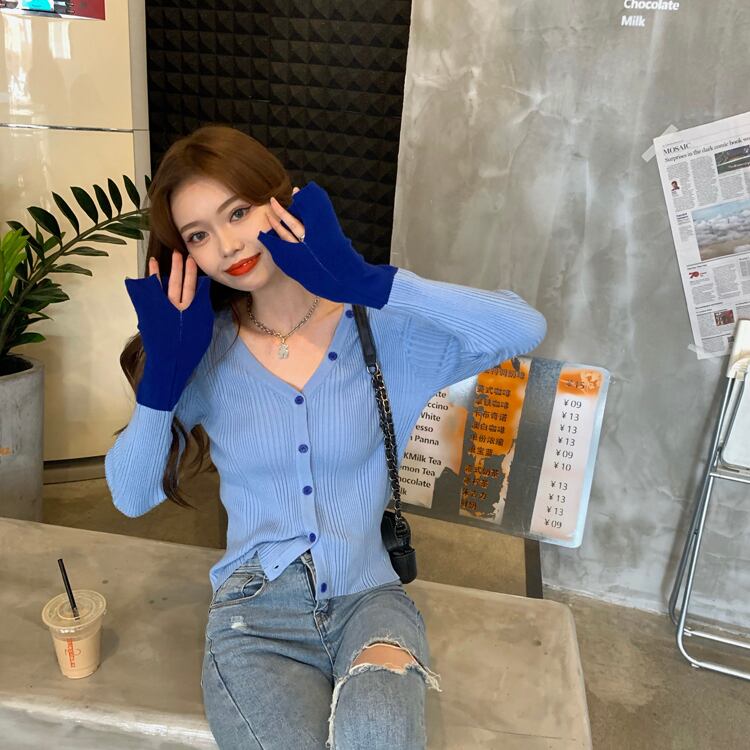 スプリングスタイルVネックカーディガントップス スリムカラー薄手ニットセーター レディース 春物 試着室91163638846
