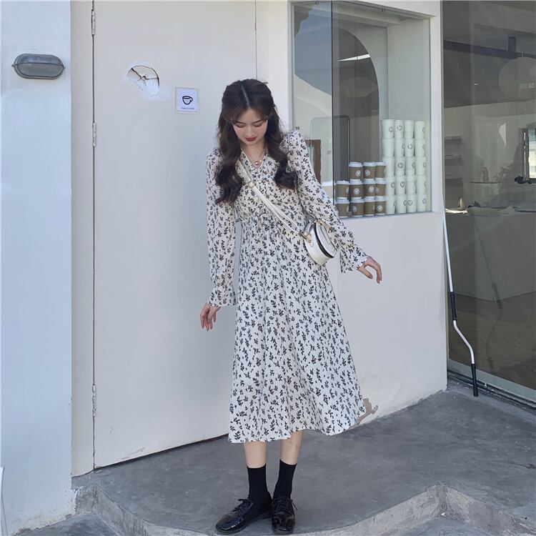 Vネックフローラルスカート スプリングスタンダードドレス レディース レトロ 春物 花柄 試着室59941136749