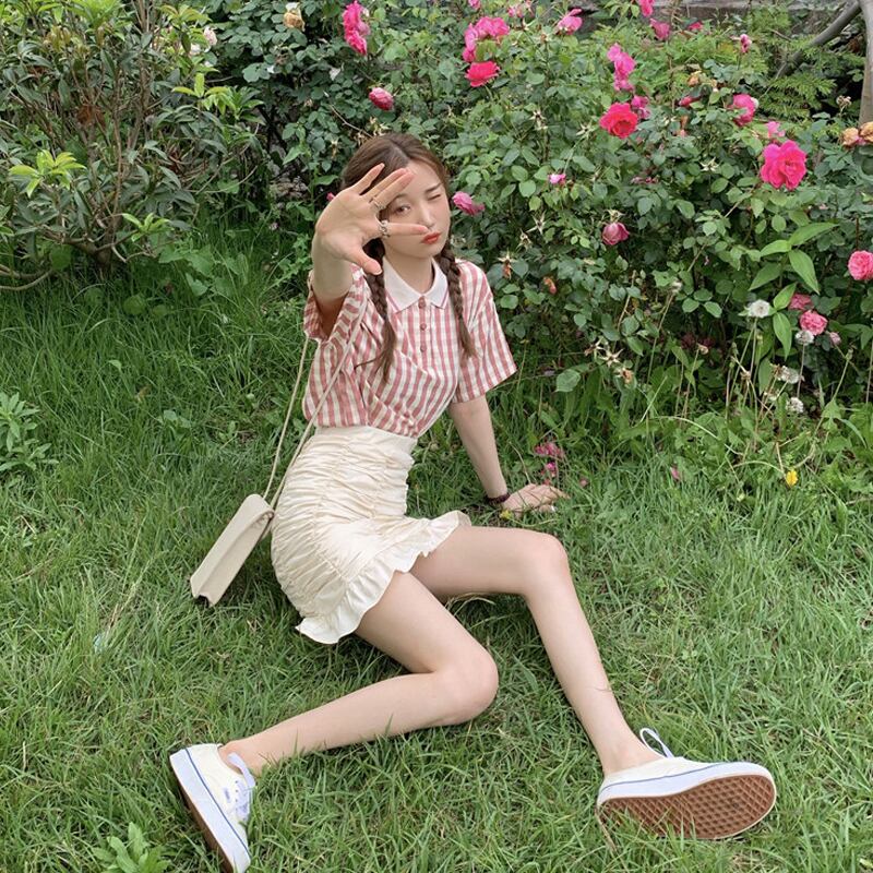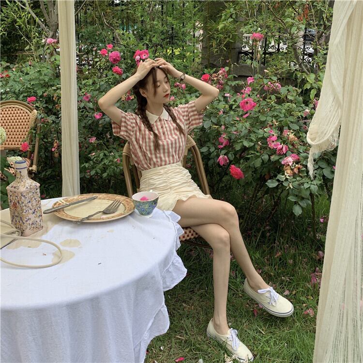 レッドスプリング格子柄Tシャツ トップス 春物 試着室88587872264