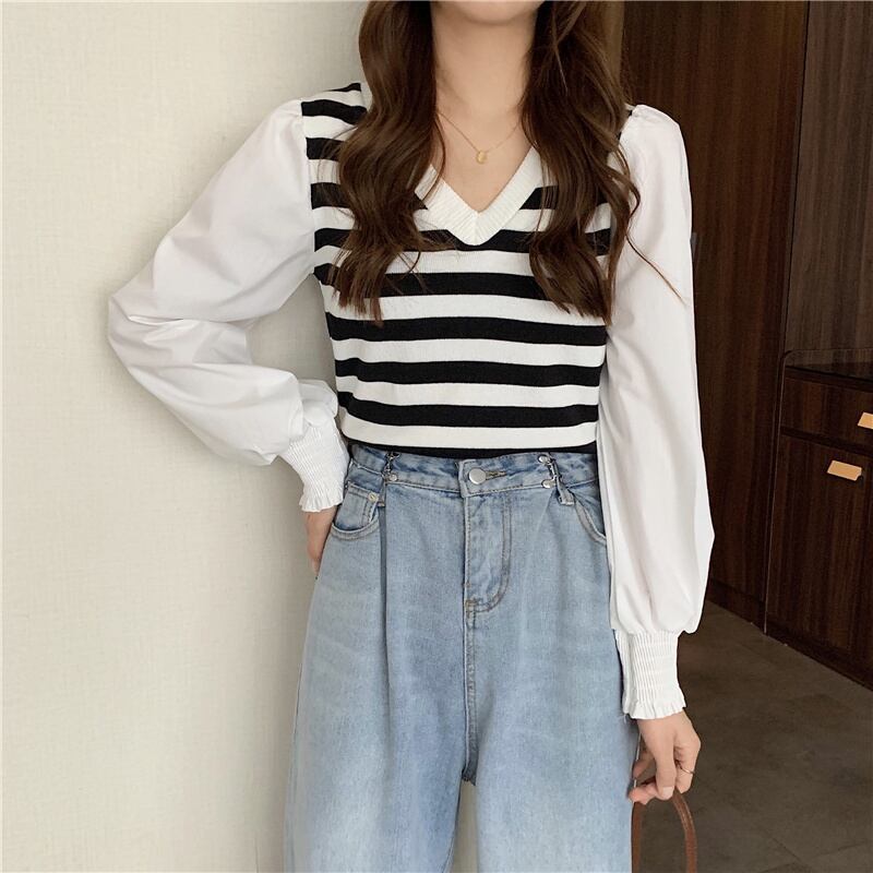スプリングスタイルスリーブシャツ ルーズVネックカラートップス ランタンスリーブ 春物 ステッチ 試着室64642982603