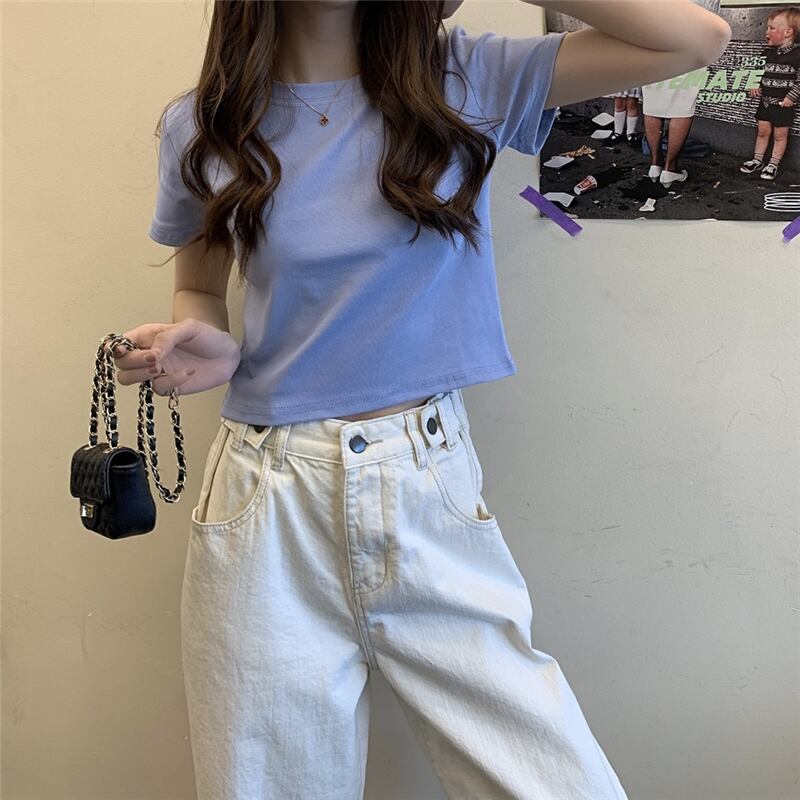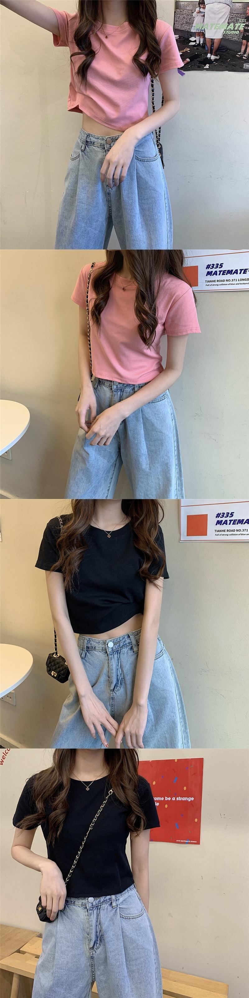 スプリングスタイルラウンドネックシャツ ソリッド カラーショートTシャツ スリムトップス 春物 Oネック ソリッドカラー 試着室20623822686