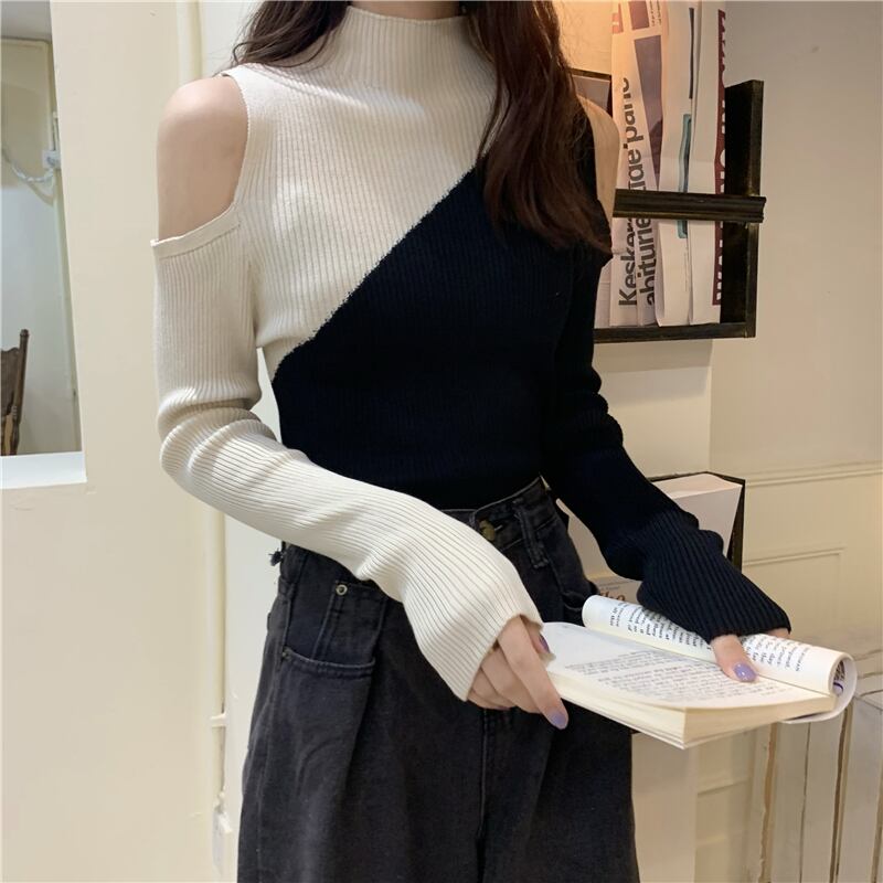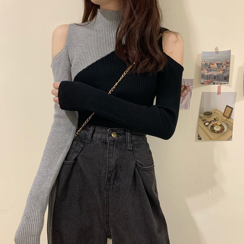 スプリングカラーセーター スタイルスリムトップス 春物 オフショルダー ステッチ 試着室19459358388