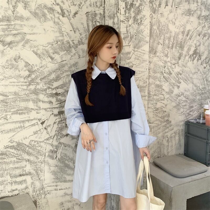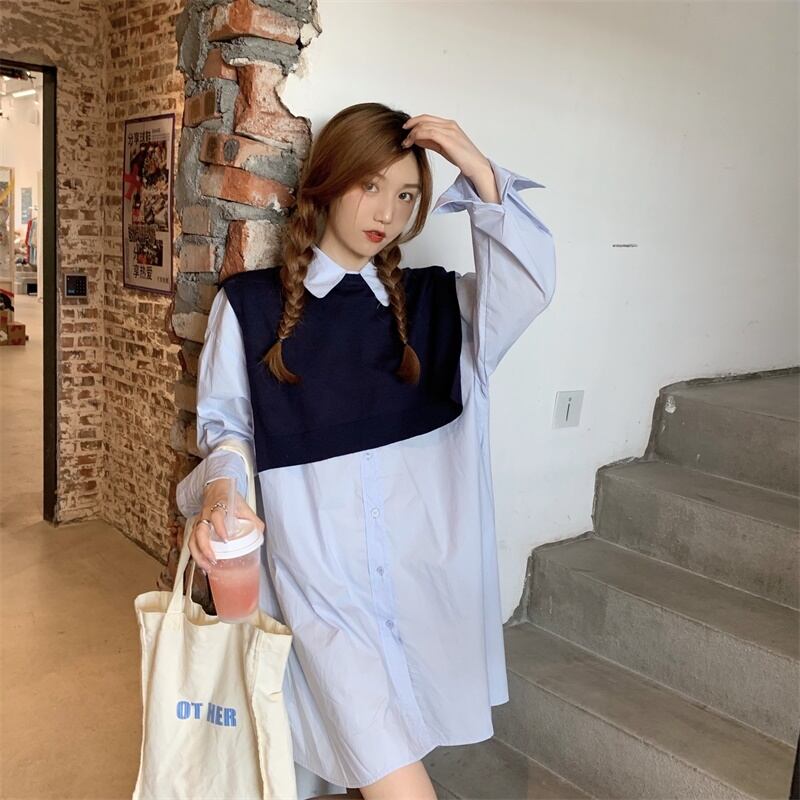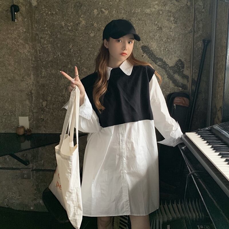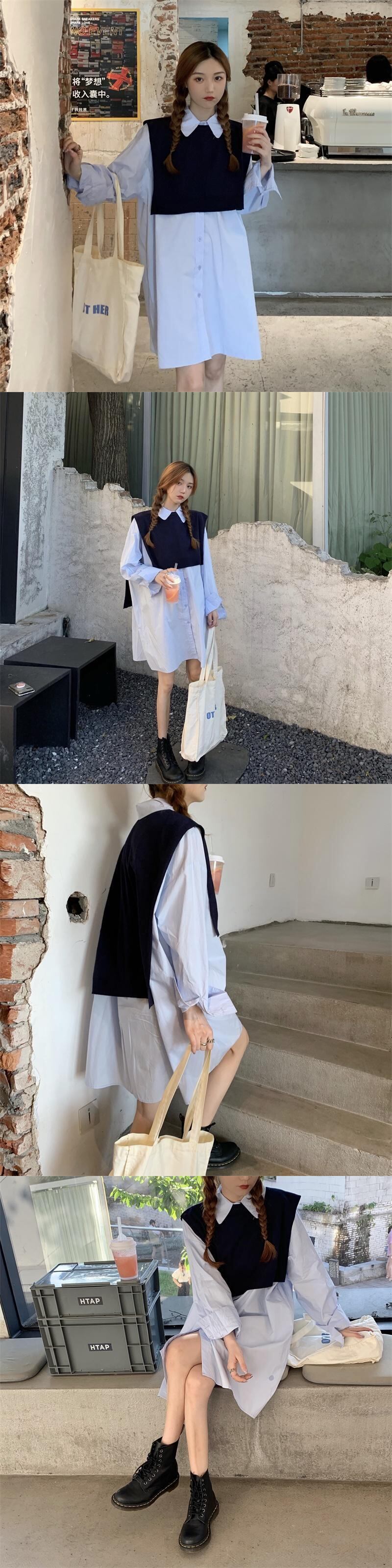 色:白いシャツのワンピース,青いシャツワンピース,ブラックベストワンピース,ネイビーのベスト