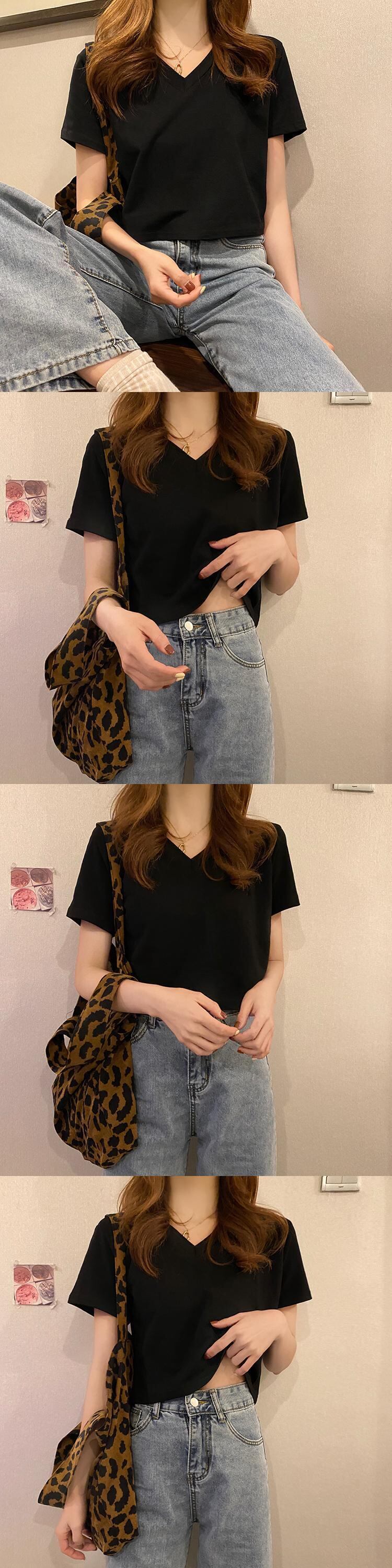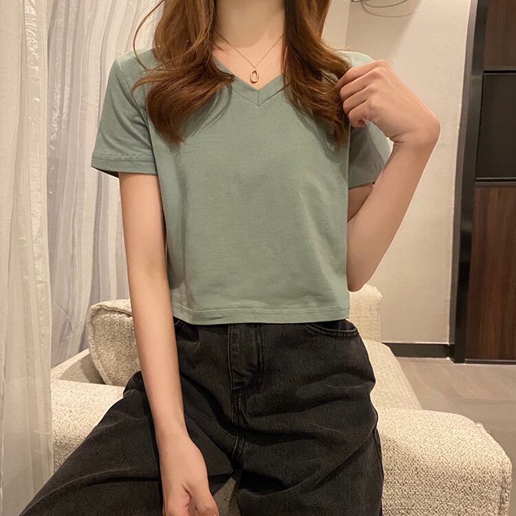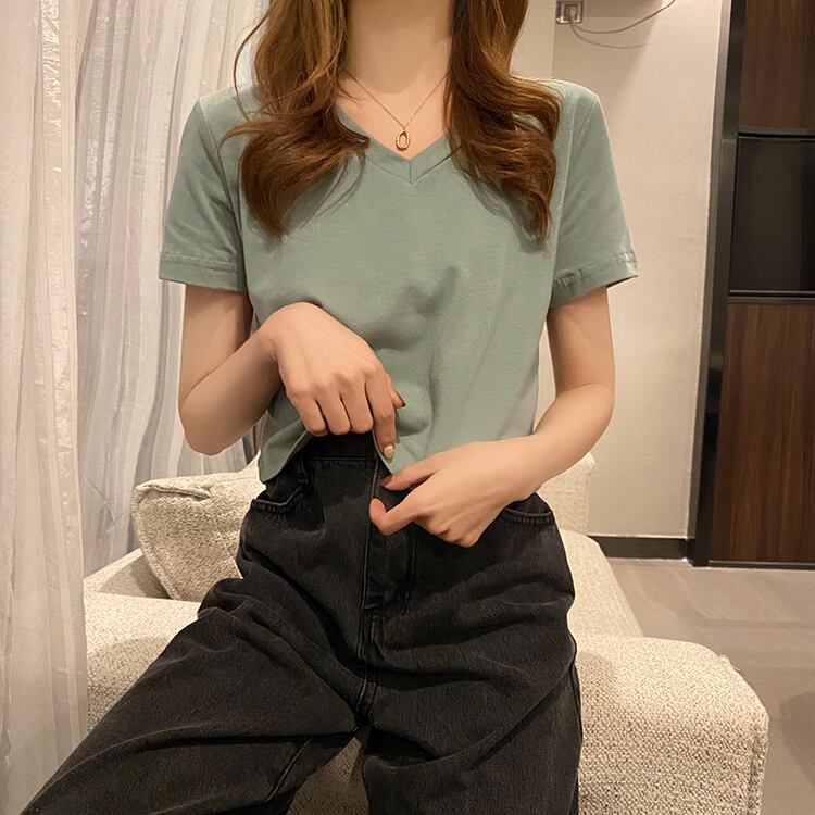 スプリングルーズショートトップス VネックTシャツ レディース 春物 試着室60528675635