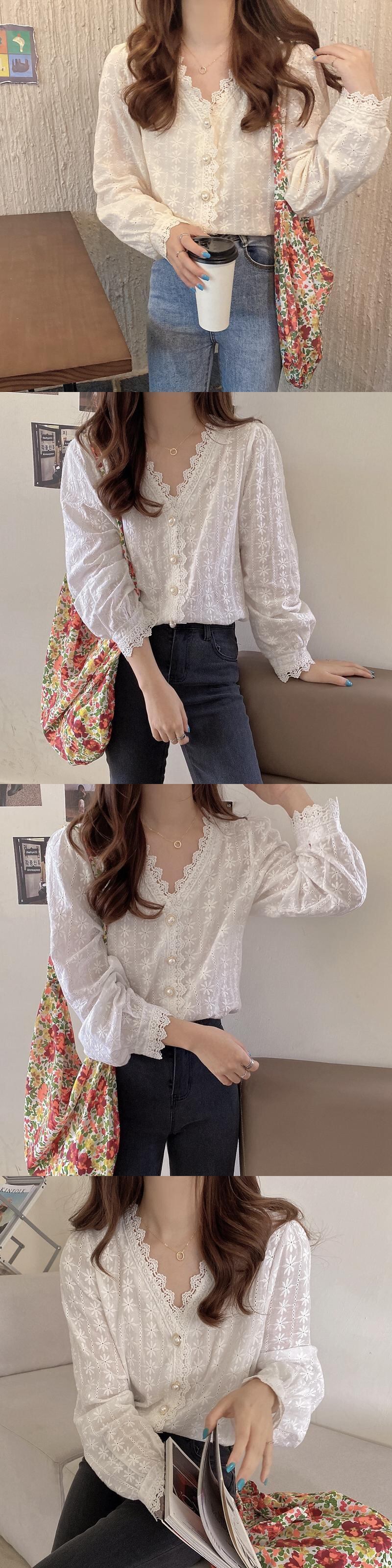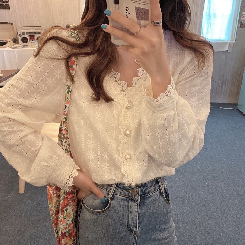 スプリングスタイルレースVネックシャツ トップス ロング 春物 試着室99877169356