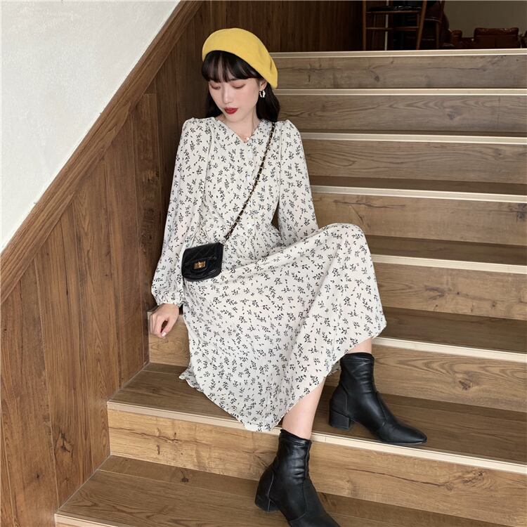 Vネックスカート スプリングスタイルスタンダードウェスト薄手フローラルドレス レトロ 春物 花柄 試着室43291126980