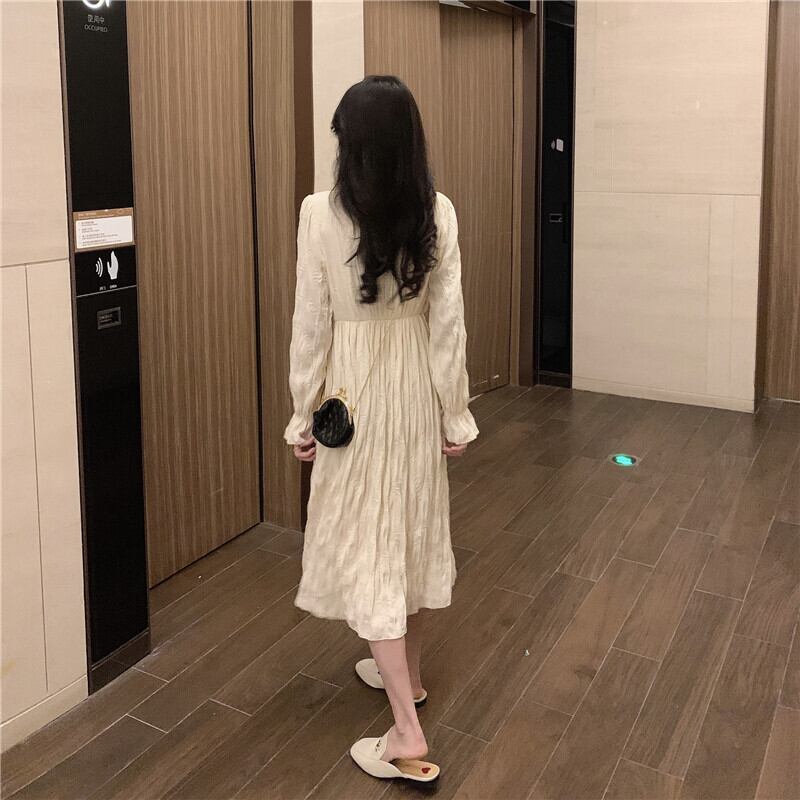 スタンダードAラインスカート スプリングホワイトVネックドレス レトロ 春物 試着室85463287282
