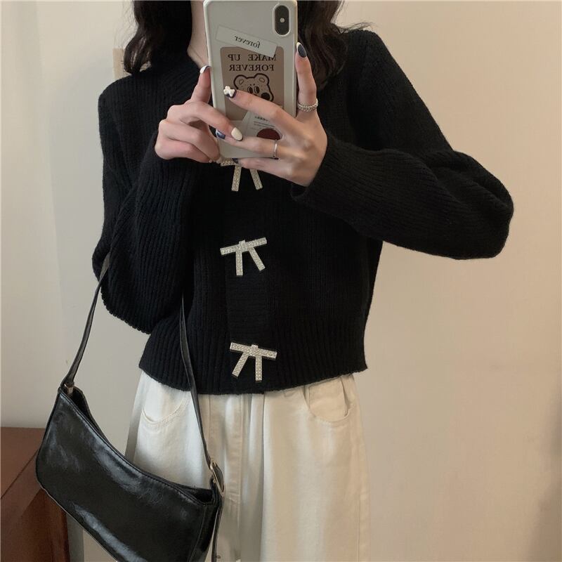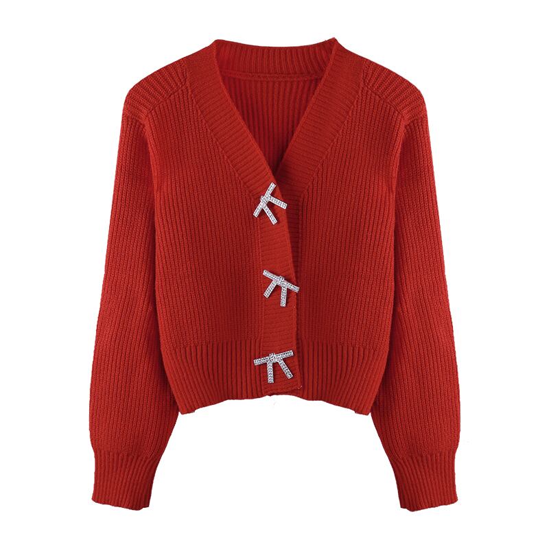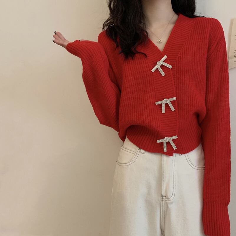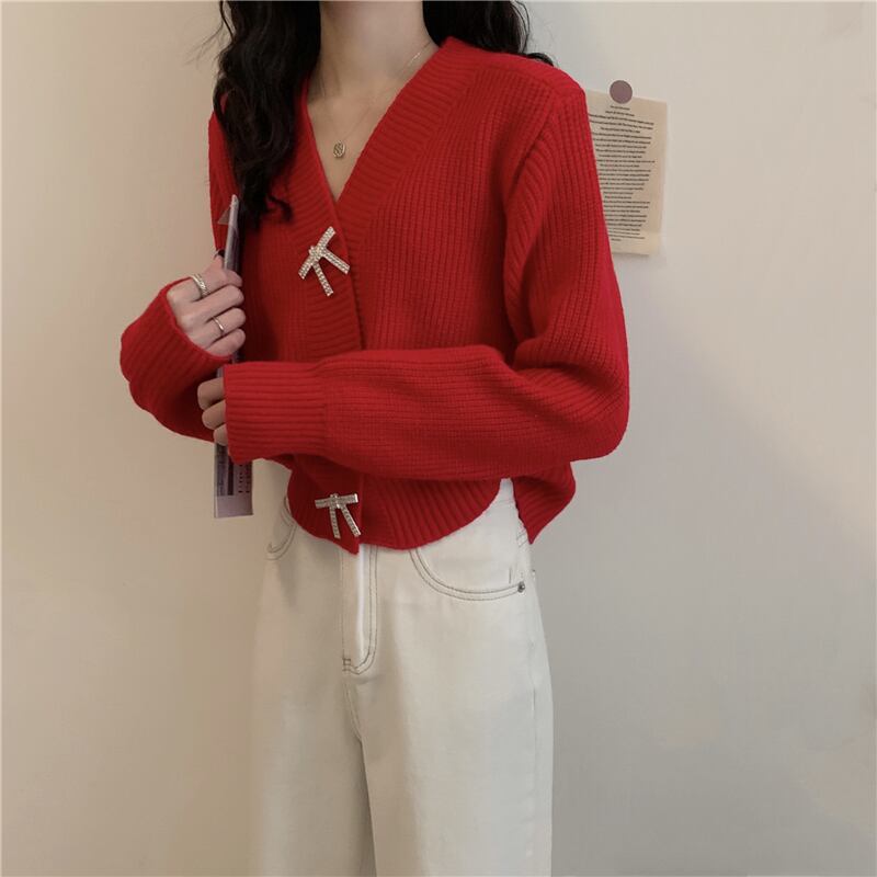 スプリングレッドリボンVネックショートカーディガンセーター レディース 春物 試着室19573371782