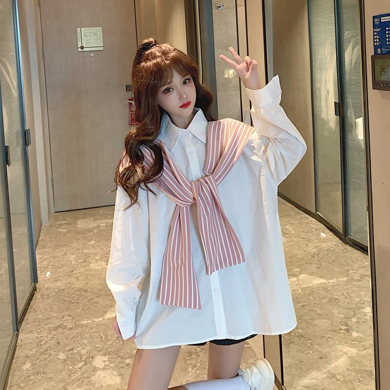 スプリングルーズ薄手ストライプシャツ ロング 春物 ステッチ 試着室84542423086