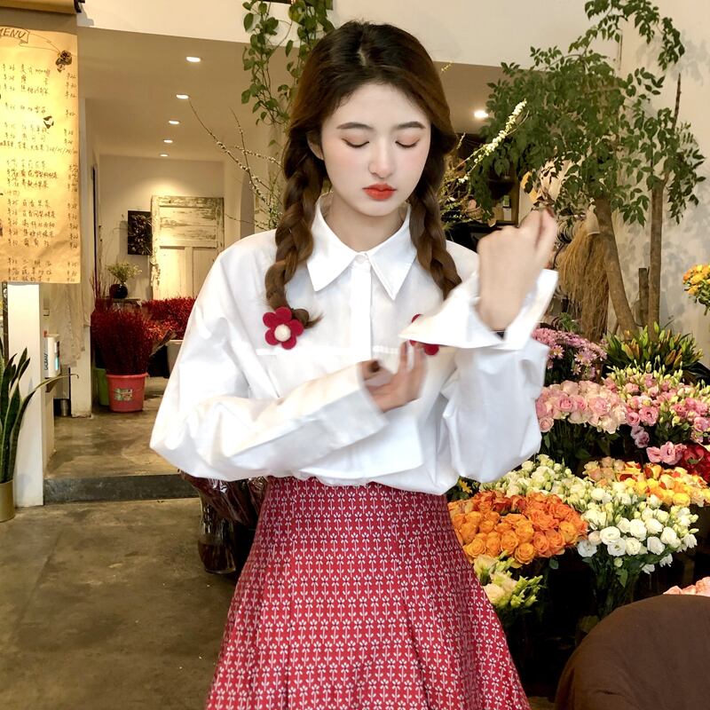 スプリングホワイトレッドFlowerデザイン ボタンシャツ ルーズ薄手ブラウス スタイルレディース 春物 フラワーデザイン 試着室9679173947