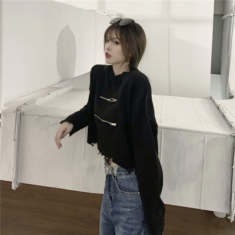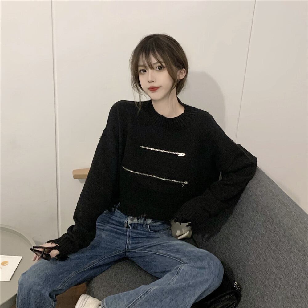 スプリングスタイルブラックセーター ショートトップス ロング 春物 試着室45390660452