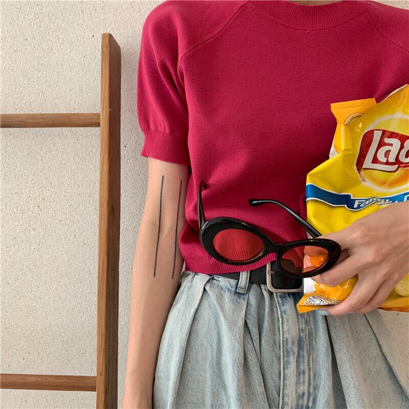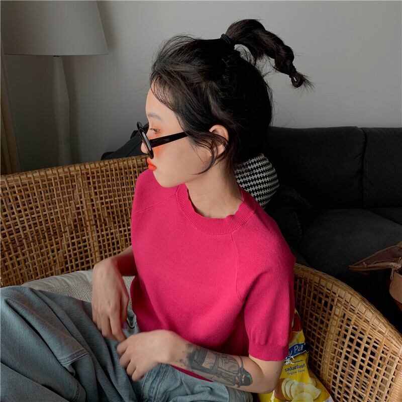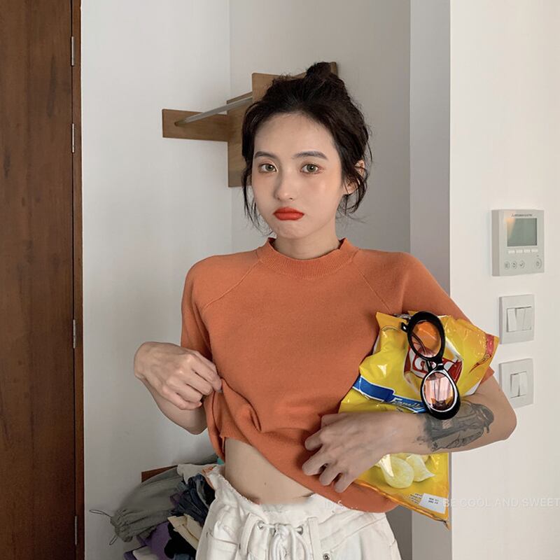サマースタイルスリムシャツ クロップドトップス ラウンドネックプルオーバー セーター レディース 夏物 Oネック 試着室75976531009