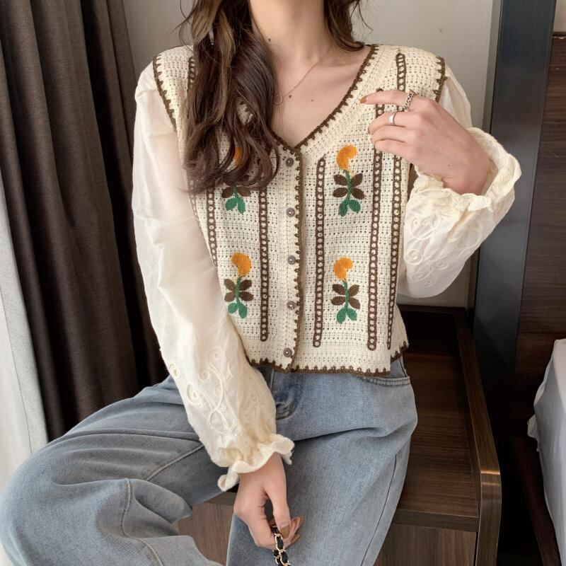 スプリングショートVネックカーディガンシャツ レディース レッド 刺繍 春物 試着室51468993432