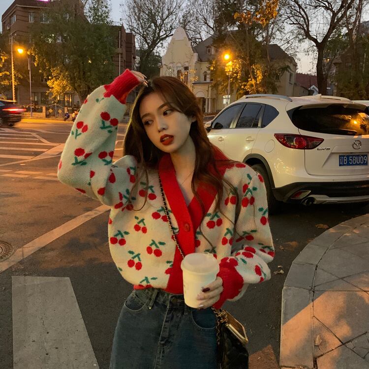 スタンダードスタイルVネックカーディガンセーター スプリングオータムレッドトップス レトロ 春物 秋物 試着室55568838167