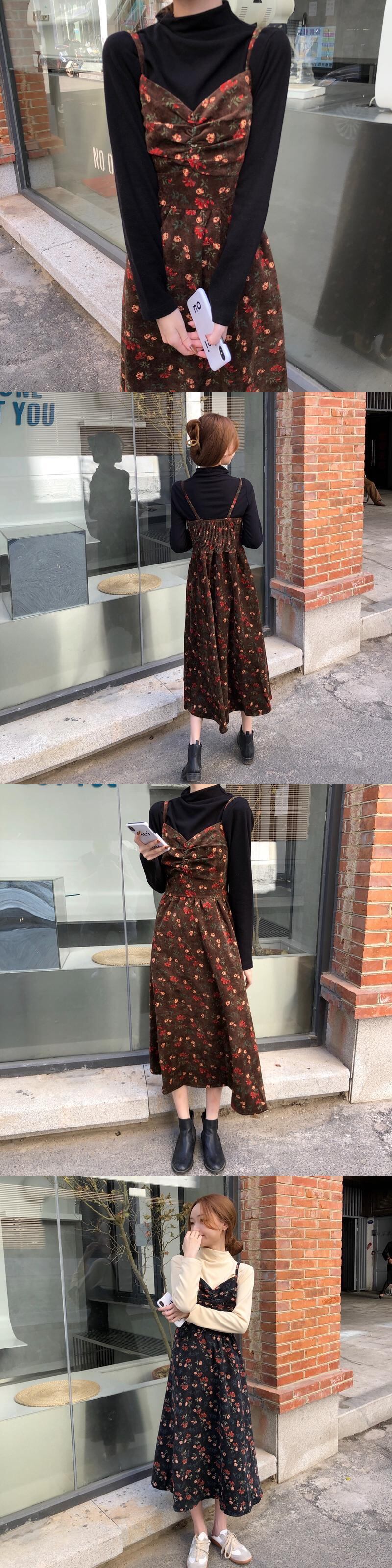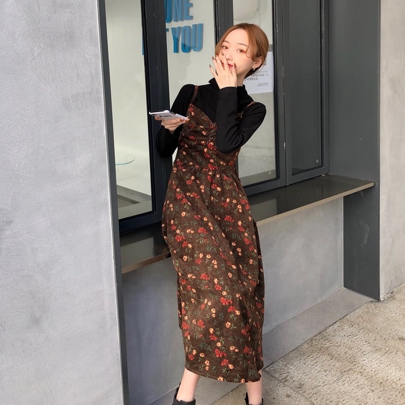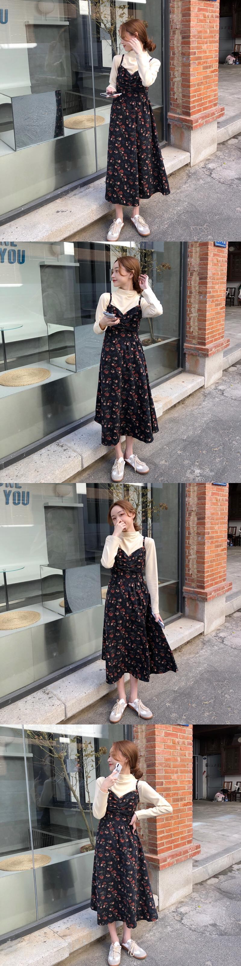色:黒底シャツ,ワンピースアプリコットボトムスシャツ,ブラウンフローラルスカートワンピース,インクブルーフローラルスカートワンピース