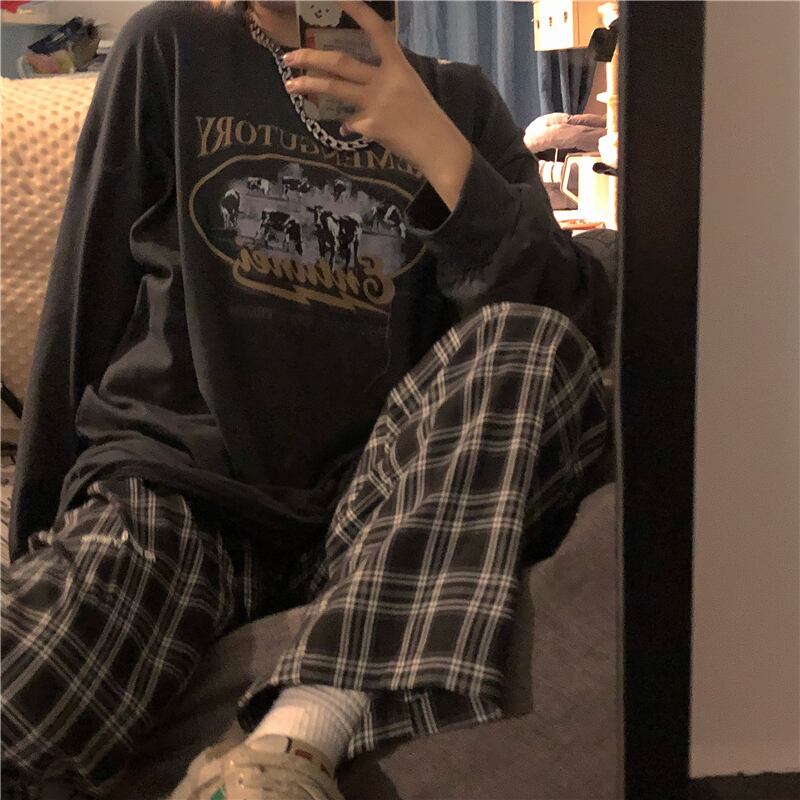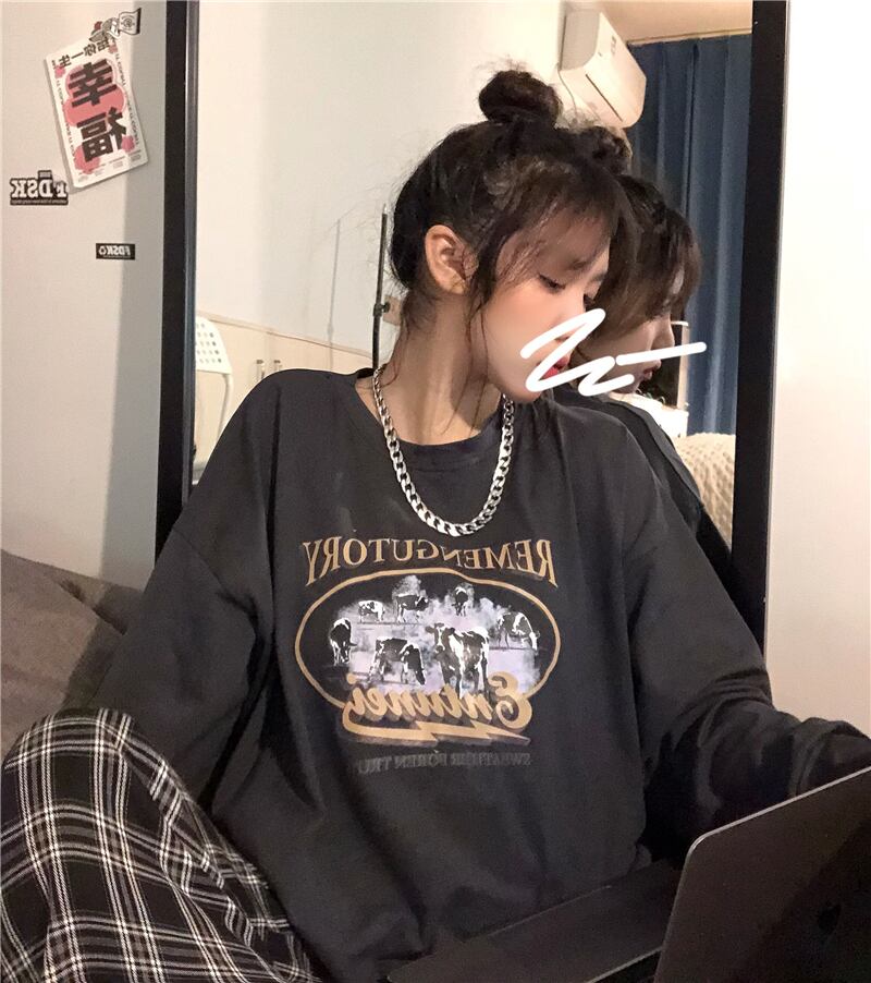 スプリングスタンダードプリント柄トップス ルーズ薄手Tシャツ ロング レトロ 春物 試着室26730777920
