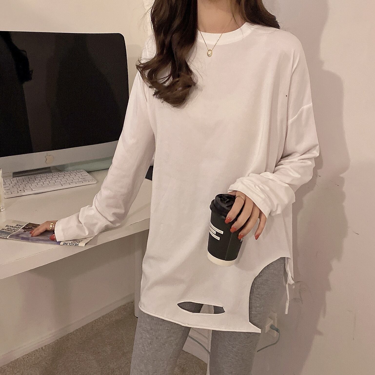 ホワイトシャツ スプリングスタイル長袖スリーブTシャツ ロング 春物 試着室25131340320