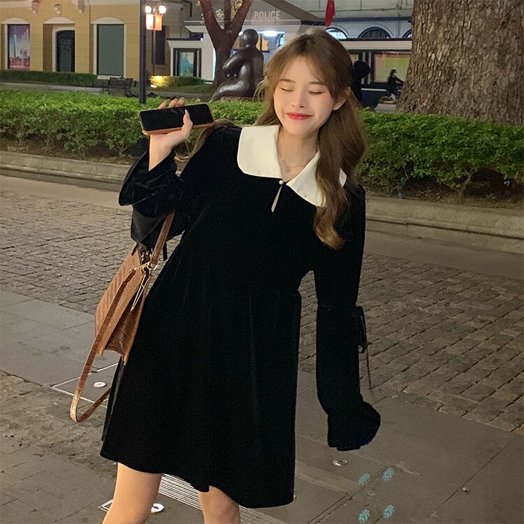 スプリングスカート スタンダードブラックドレス カラーベルベット ロング レトロ 大人ガーリー スウィート キュート カジュアル 春物 試着室96401523887