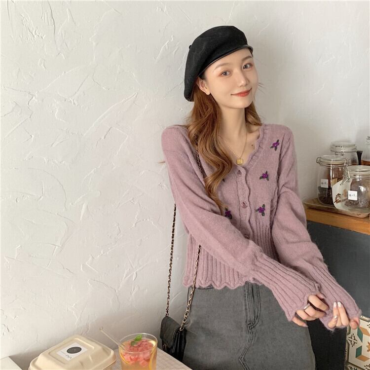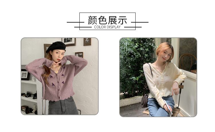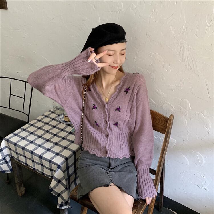 セーター ジャケット スプリングオータム薄手ニットカーディガンVネックショートトップス 春物 秋物 パープル 試着室99443023878