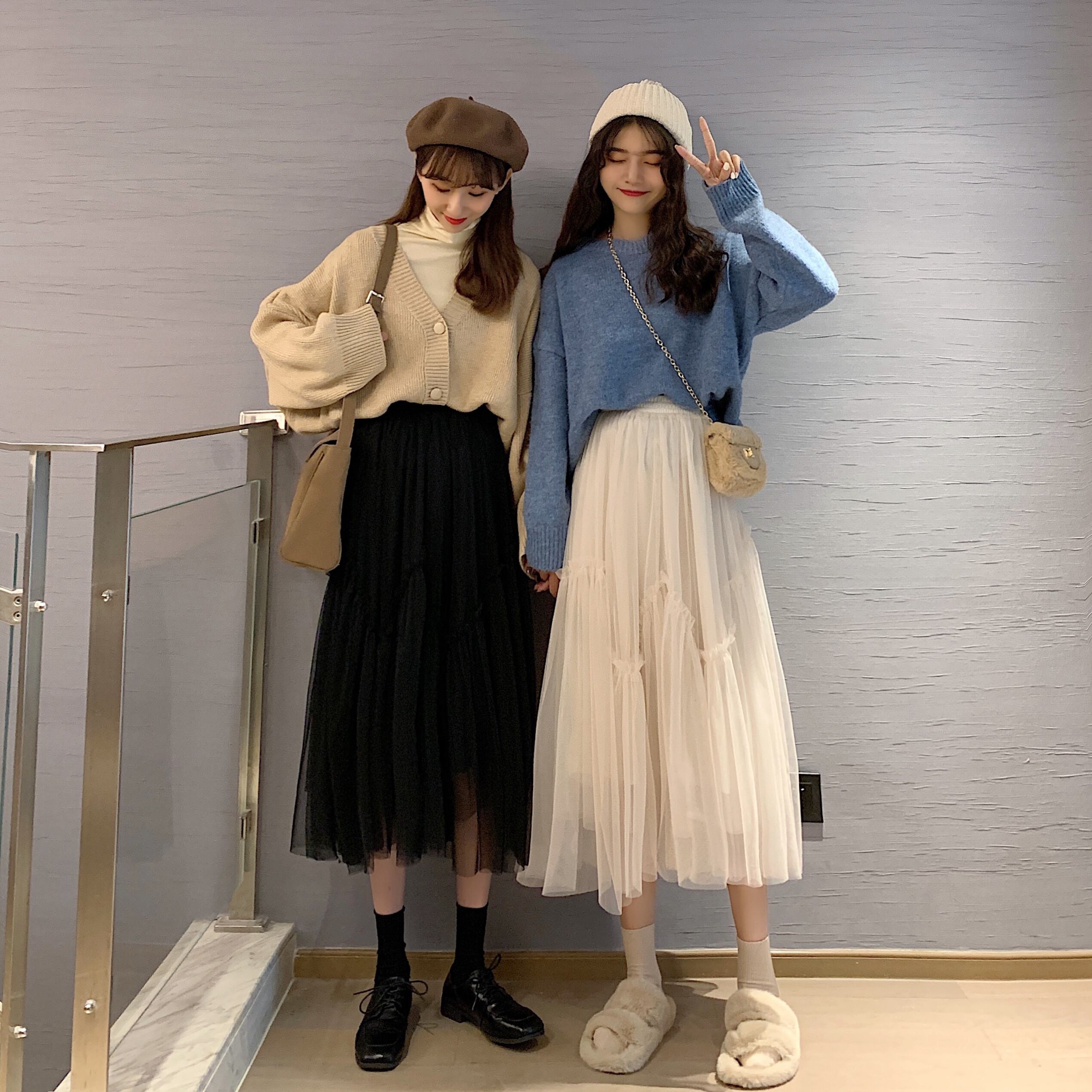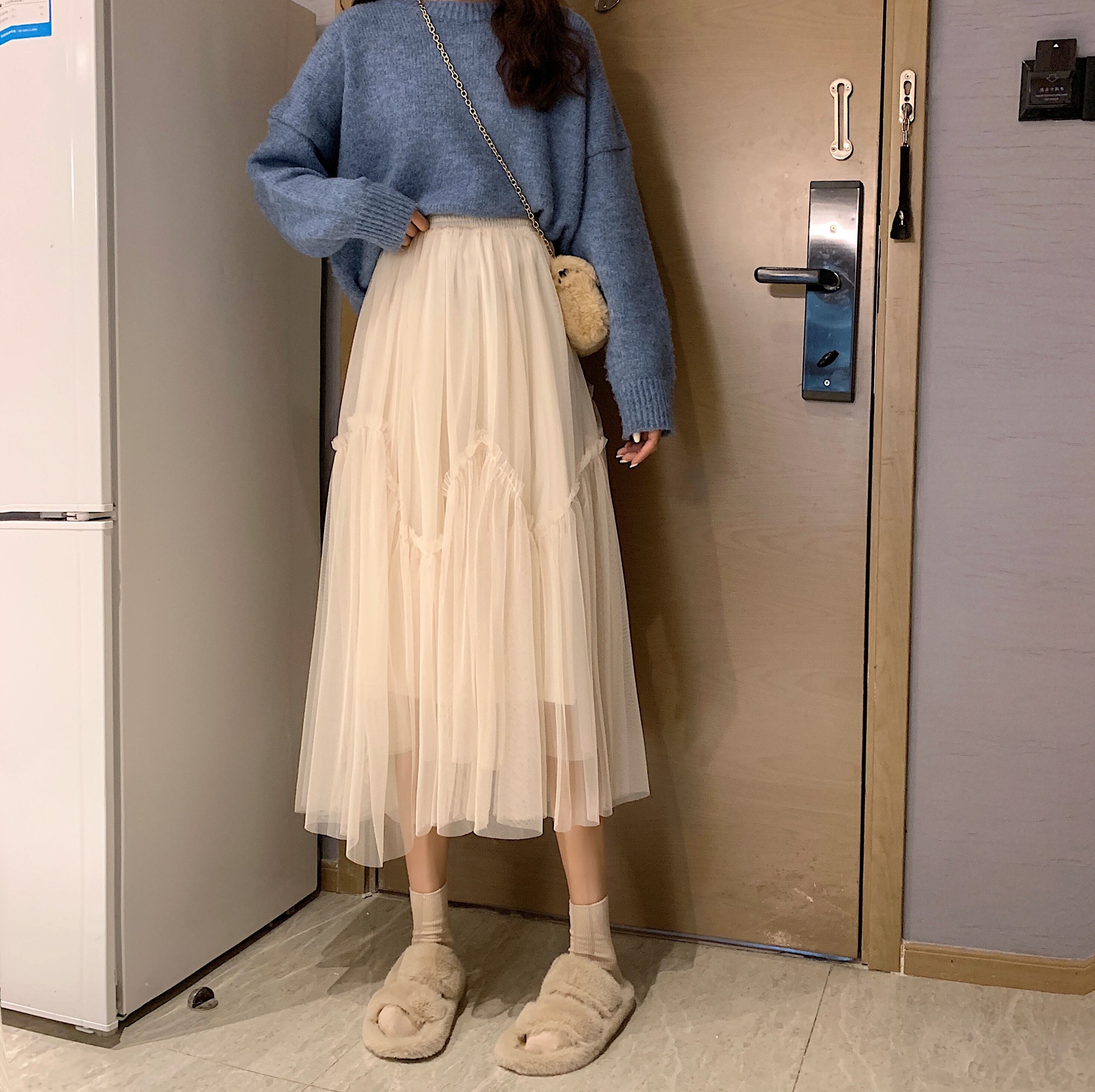 スカート オータムウィンターハイウェストウェスト薄手Aラインメッシュ 秋物 冬物 試着室88630355390
