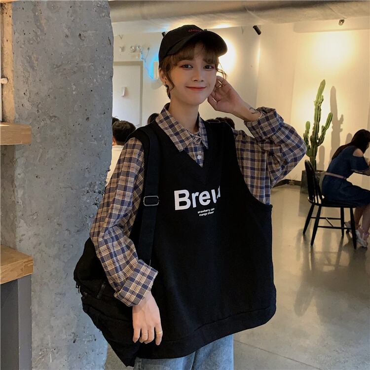 スプリングブラック格子柄シャツ ロング 春物 ステッチ 試着室85198922107