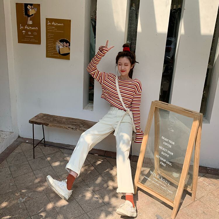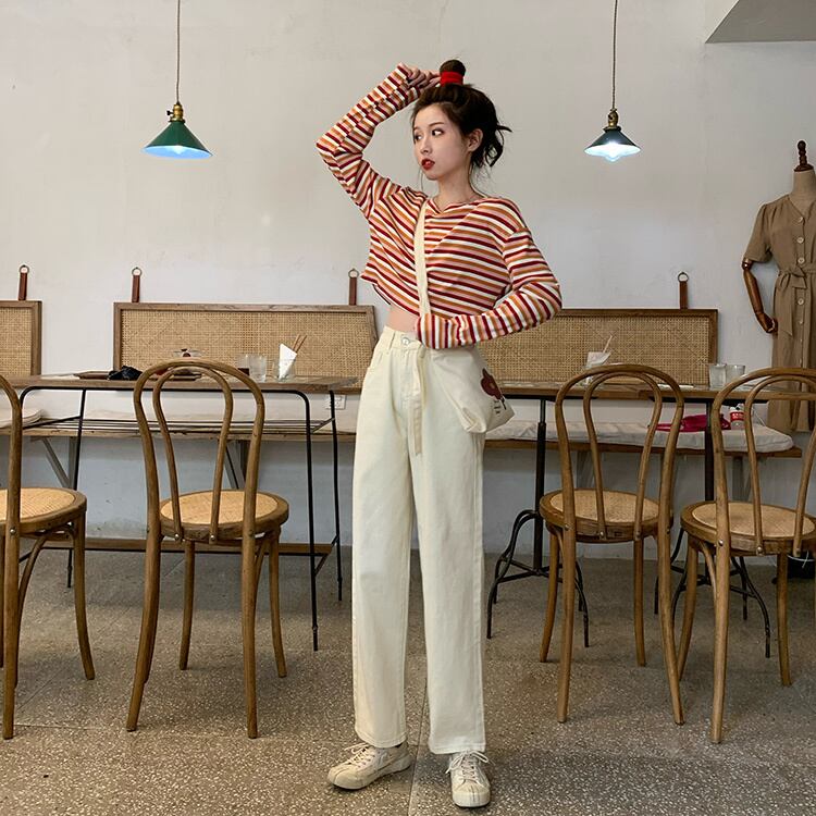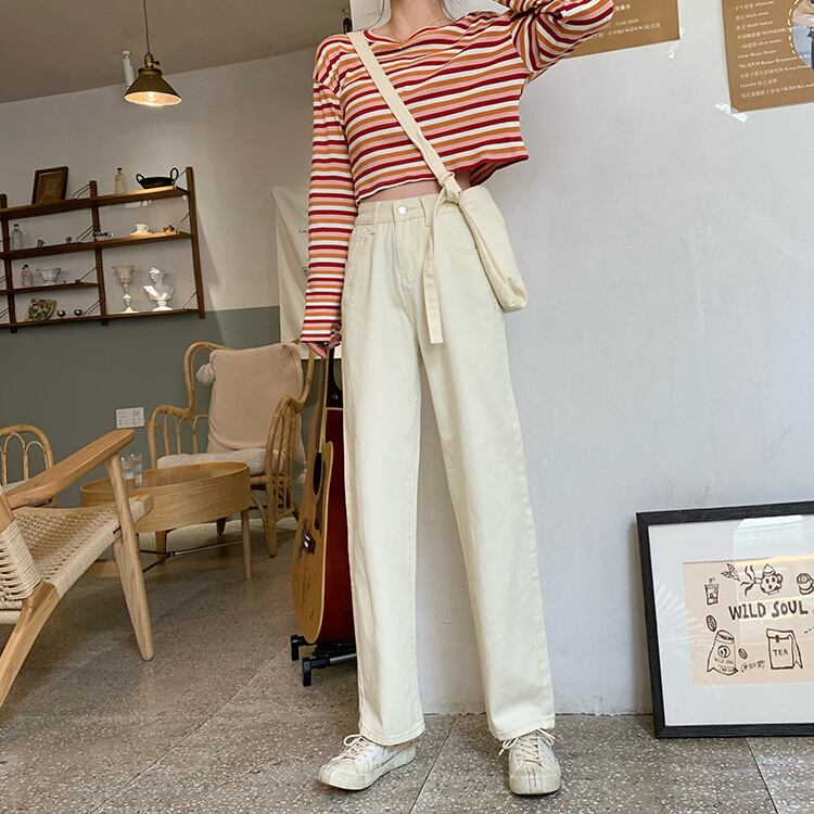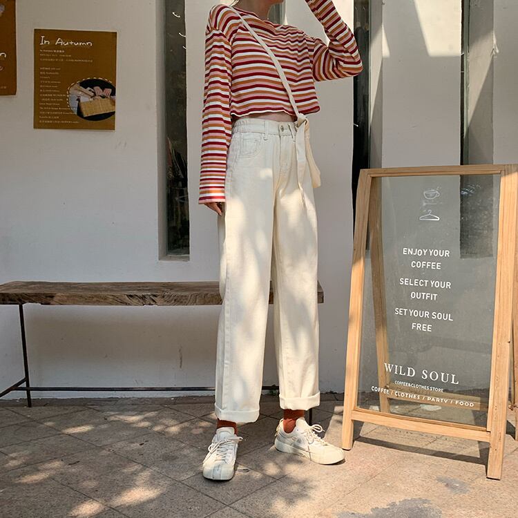 スプリングパンツ ホワイトオータムルーズワイドレッグハイウェストウェストスリムジーンズ 春物 秋物 ワイドパンツ 試着室30344517778