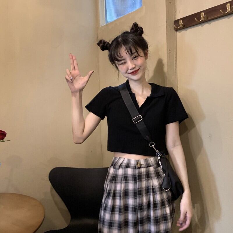 色:ブラックトップシングルピース,チェック柄パンツ,シングルプリーツスカート