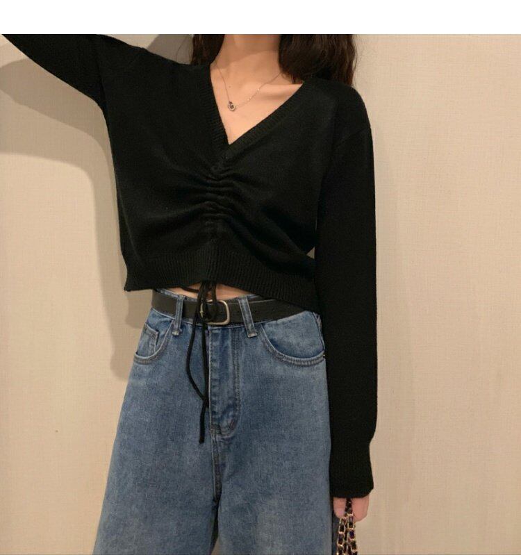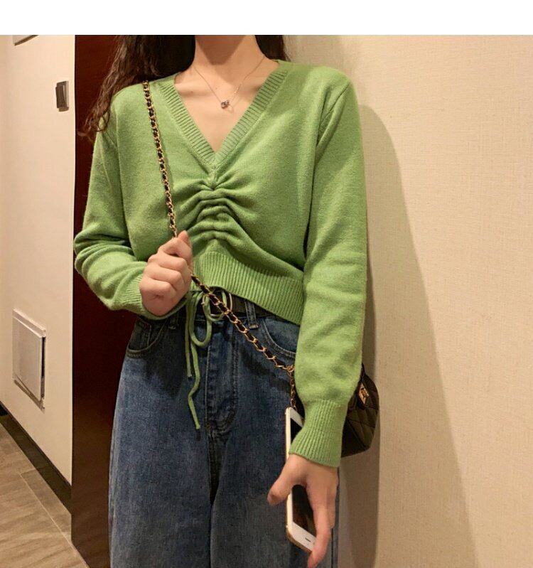 スプリングスリムニットセーター Vネックショートギャザートップス レディース ロング 春物 試着室60567618741