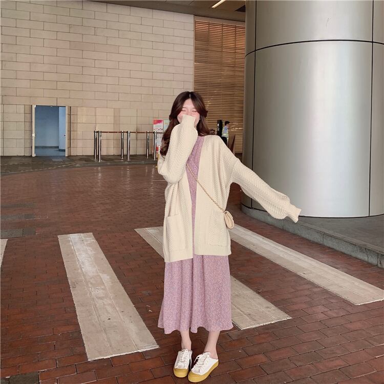 色:カーディガンセーターワンピース,花柄スカートワンピース