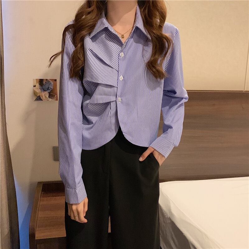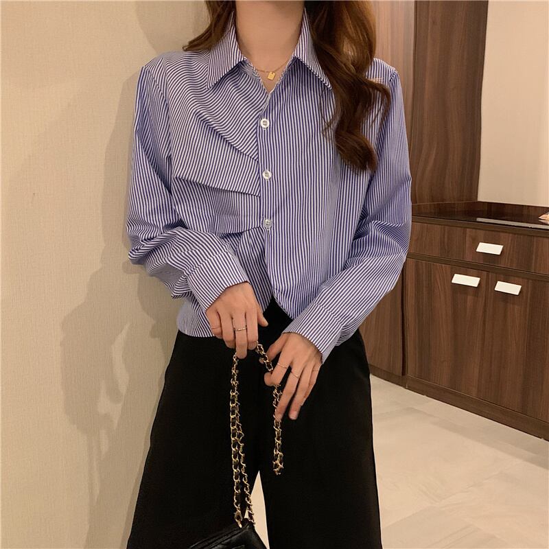 ブルーストライプシャツ スプリングオータムスタンダードスタイルショートトップス ロング レトロ 春物 秋物 試着室64316386831