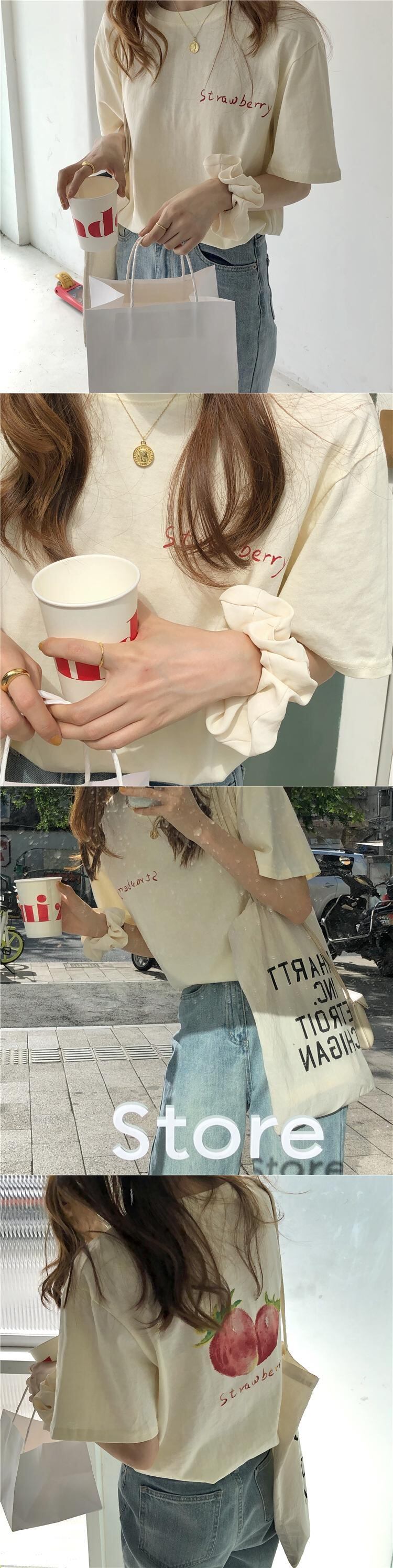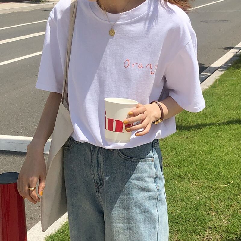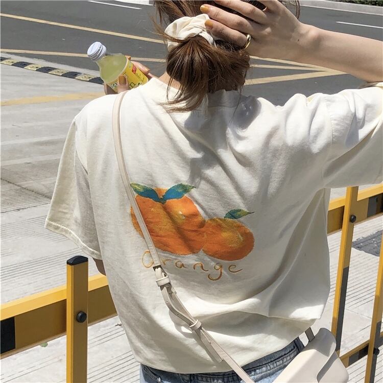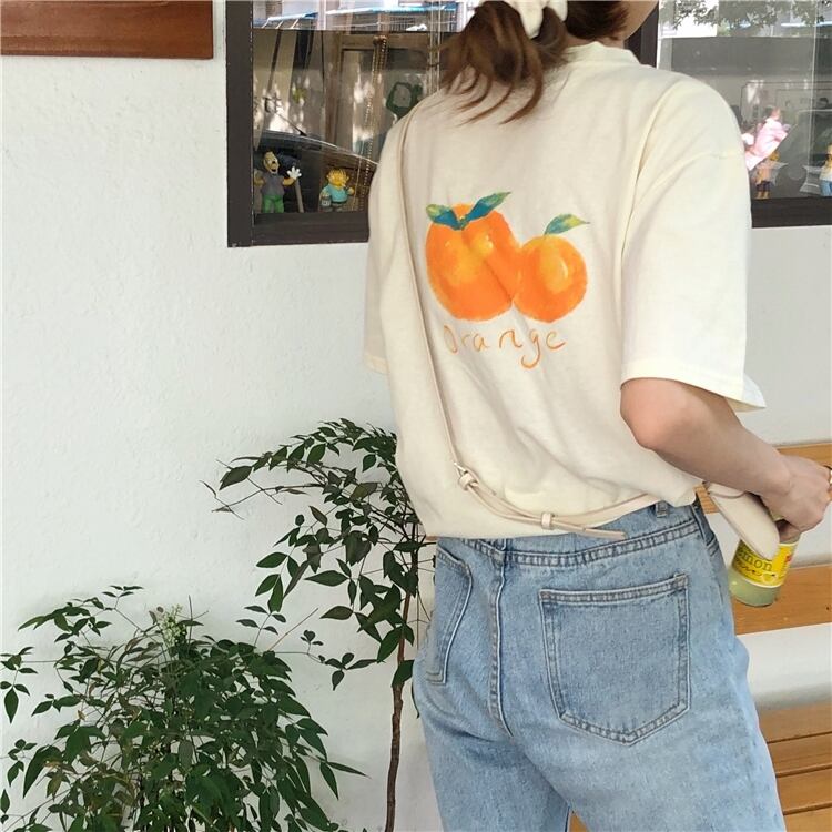 サマーオレンジプリントルーズラウンドネックカジュアルTシャツ レディース 夏物 Oネック 試着室6709128636