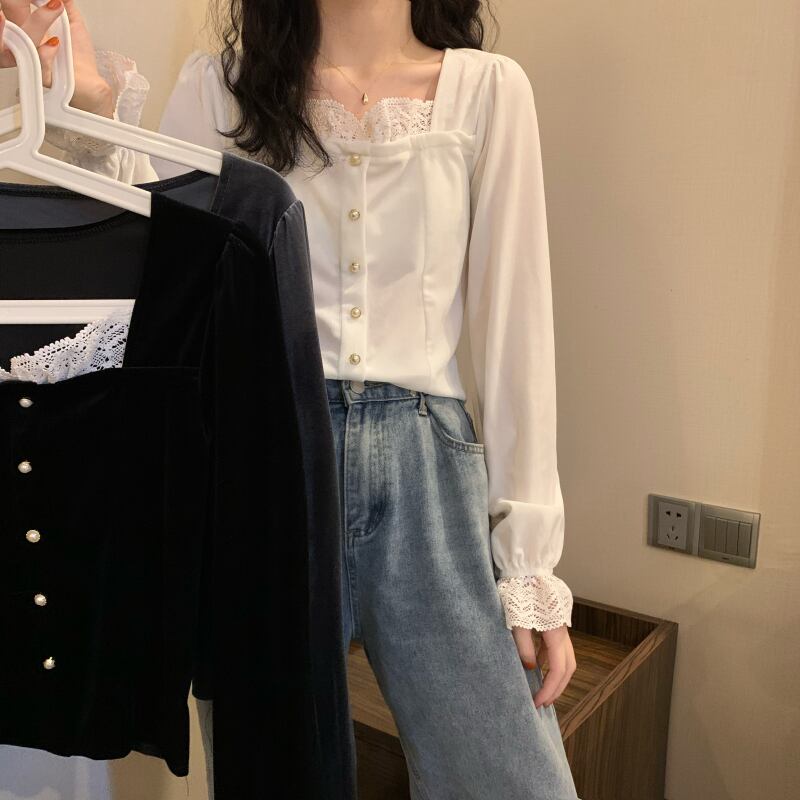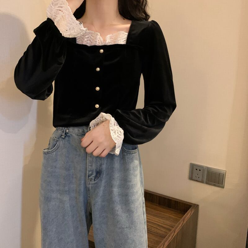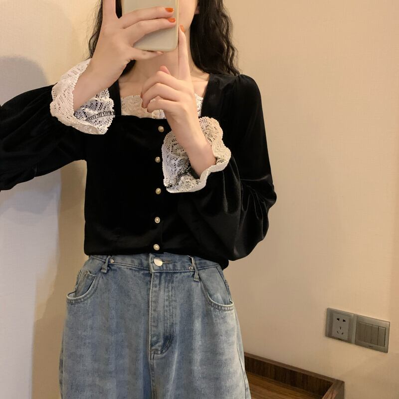 カラーブラックトップス スプリングシャツ オータム ロング 春物 秋物 スクウェア 試着室48356857425