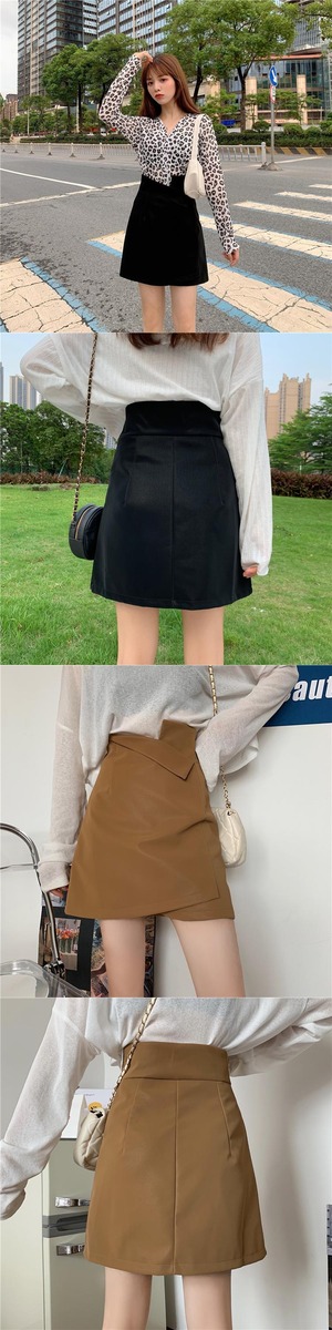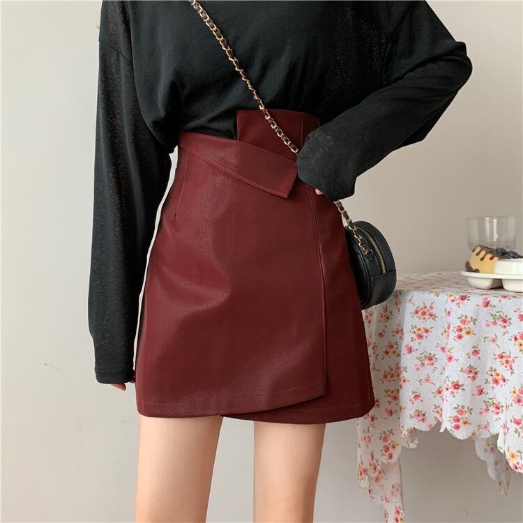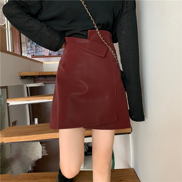 ショートスカート スプリングオータムハイウェストウェスト薄手レザーレッドAライン 春物 秋物 試着室82235077255