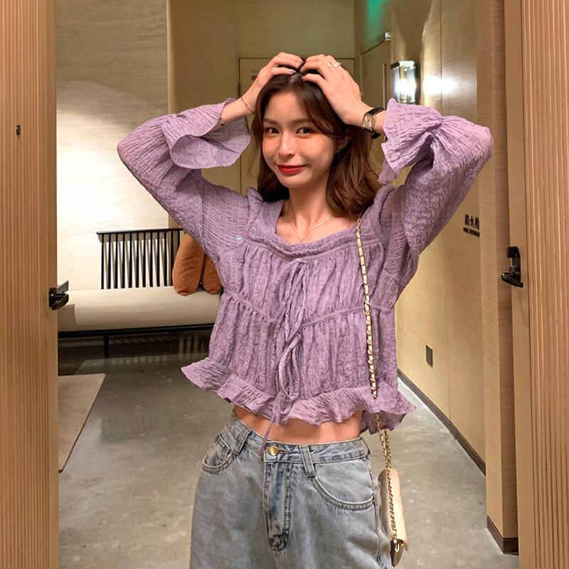 シャツ スプリングスタイルルーズカラーショートトップス 春物 パープル スクウェア 試着室20297693911