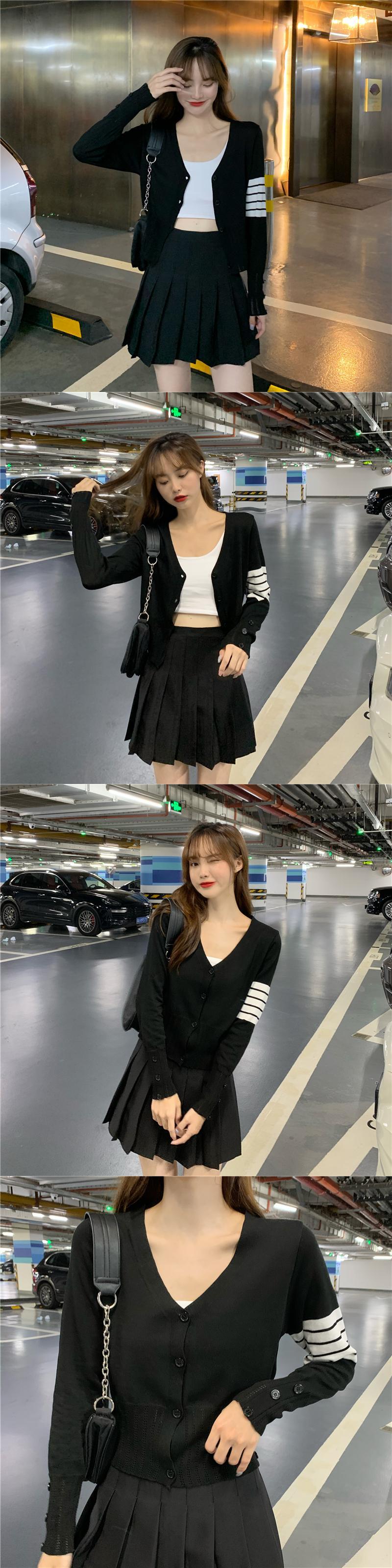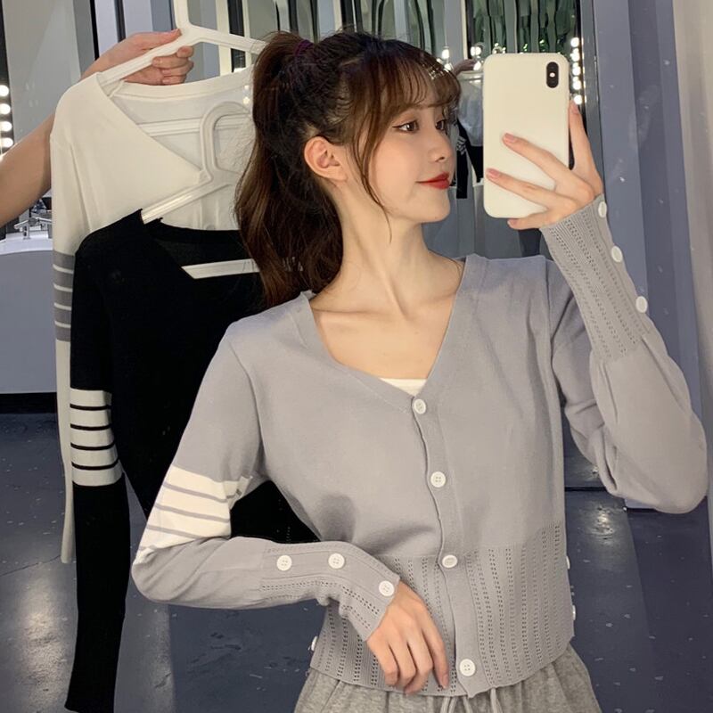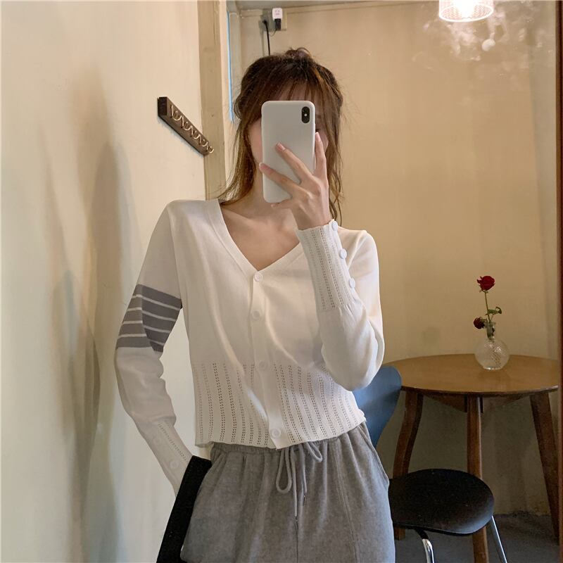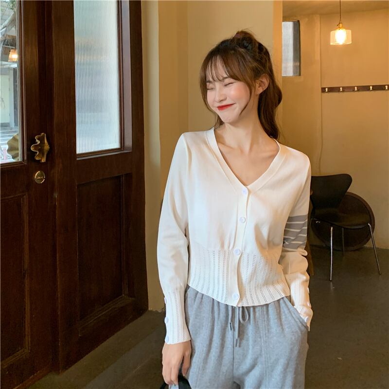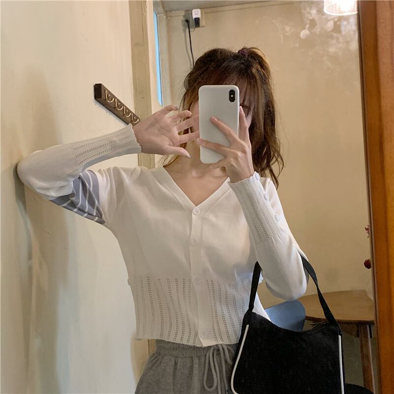 Vネックカーディガンショートトップス スプリングオータムスタイルセーター レディース ロング 春物 秋物 試着室18581774171