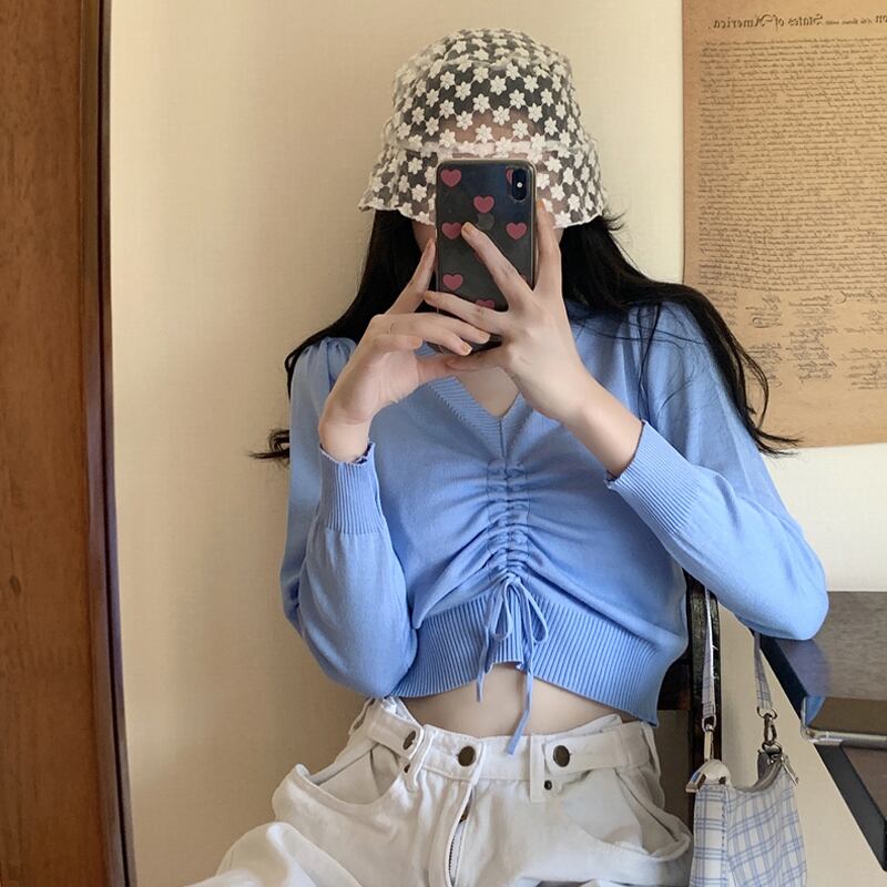 スプリングオータムレッドスリムVネックセーター レディースショートトップス ロング 春物 秋物 試着室45017784717
