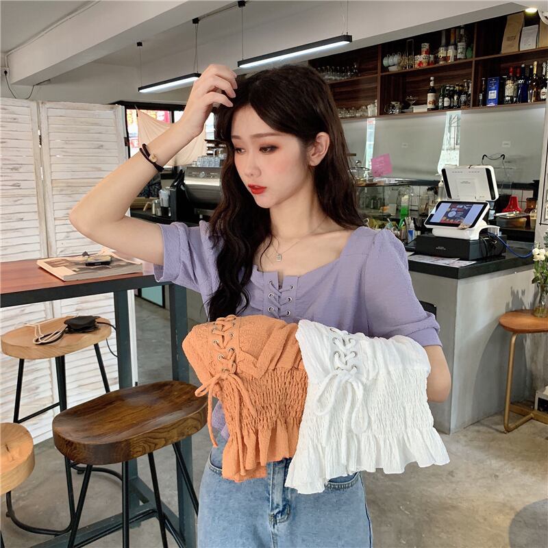 スプリングトップス ウェストショートシャツ カラー半袖スリーブ ハーフスリーブ 春物 パープル スクウェア 試着室90926455105