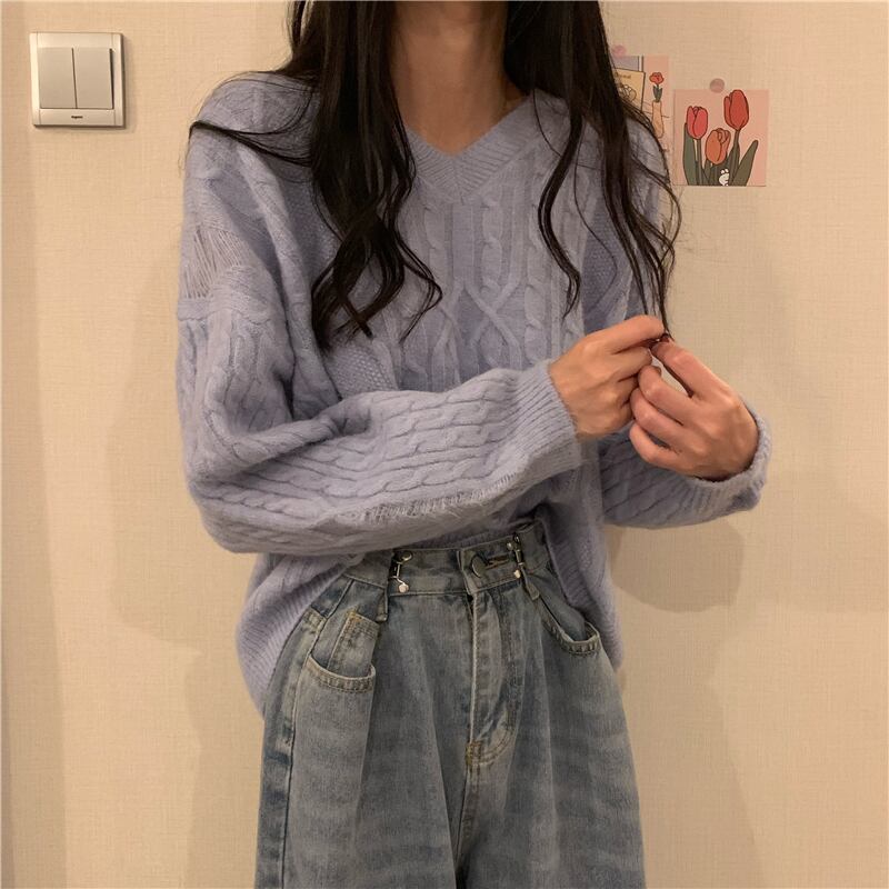 スプリングルーズホワイトVネックセーター スタイルニットトップス 春物 試着室65567440497