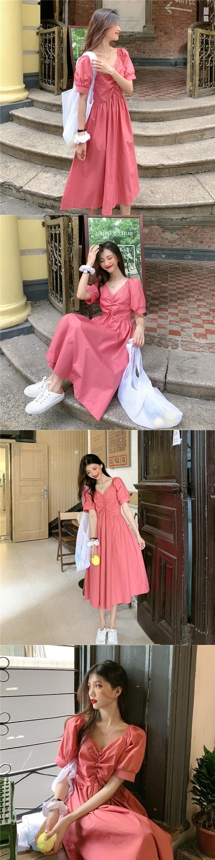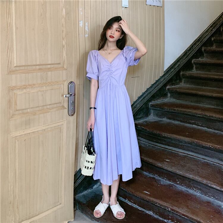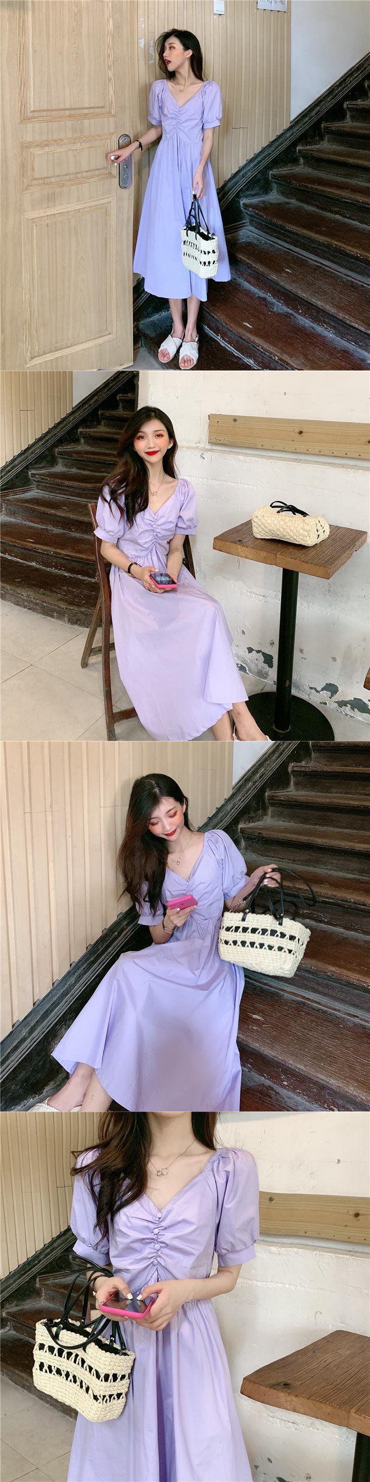 Vネックドレス サマースタイルウェスト薄手Aラインスカート ロング 夏物 パープル 試着室94368436068