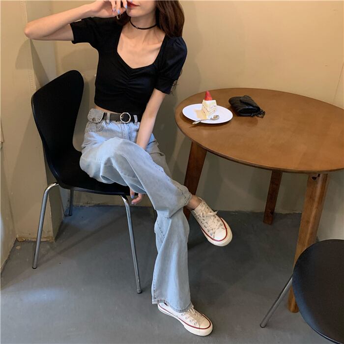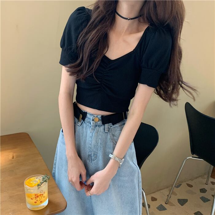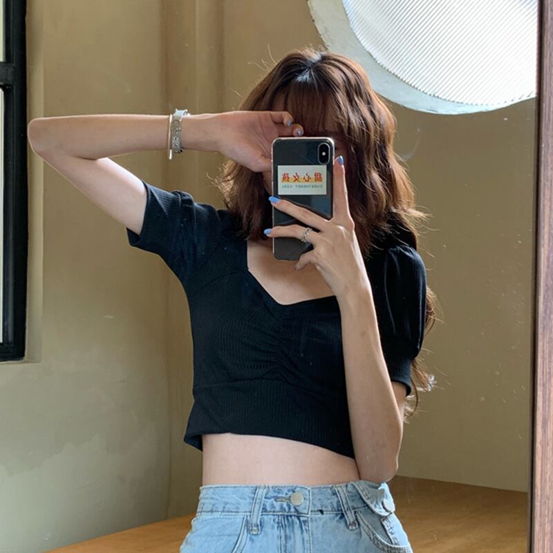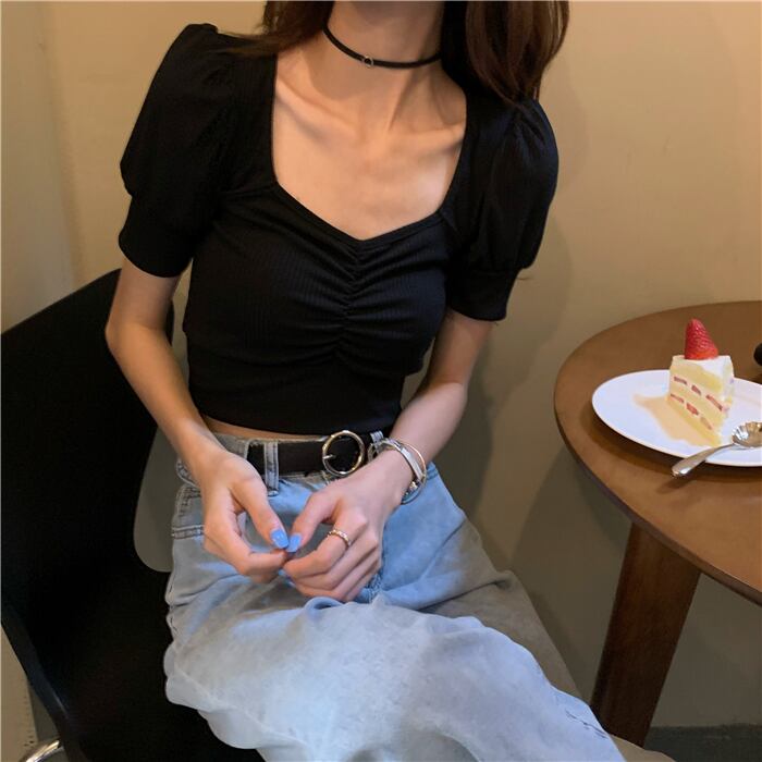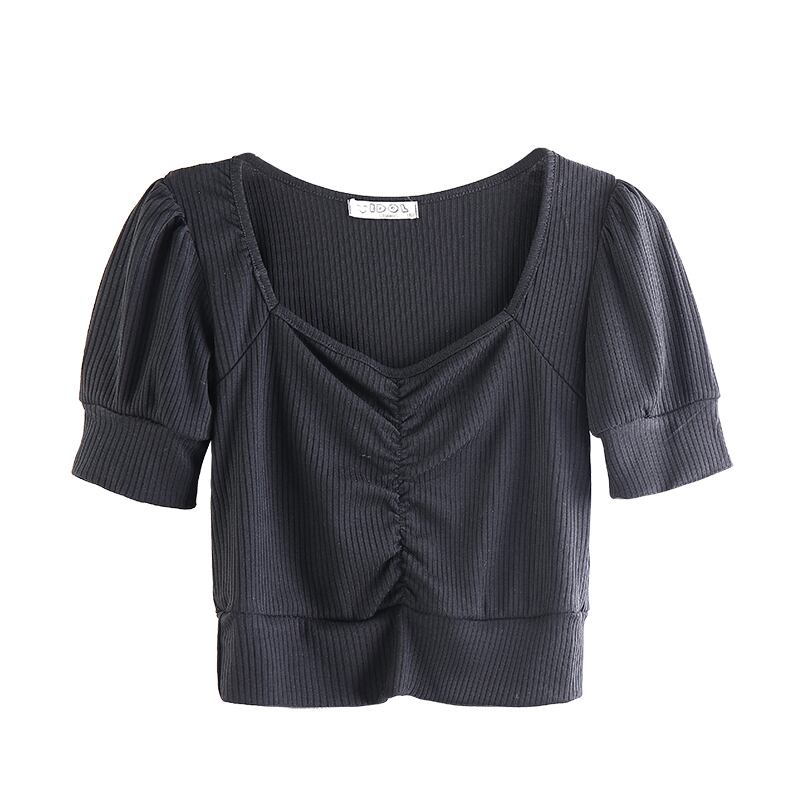 ブラックショートスリーブセーター Vネックシャツ スリムトップス サマー 夏物 試着室46891536864