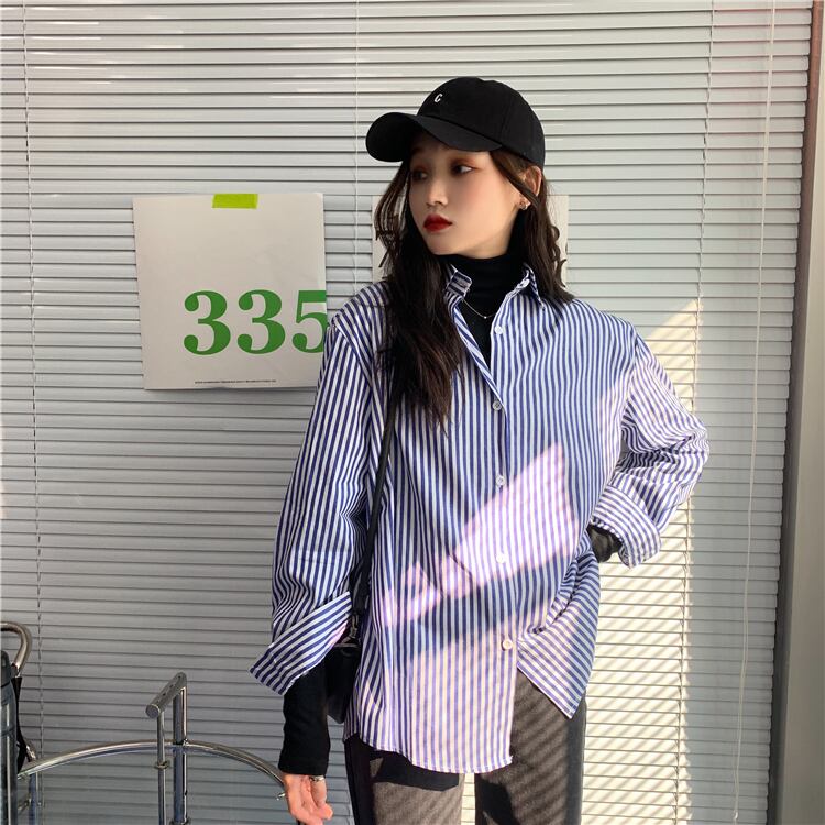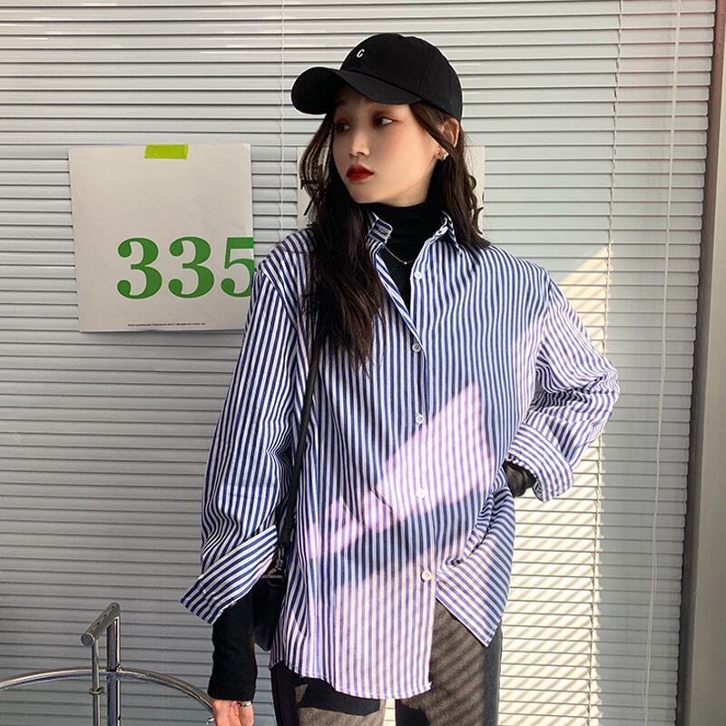 スプリングスタイルルーズスタンダードブラウス ストライプシャツ レディースシャツ ロング レトロ 春物 試着室88545089960