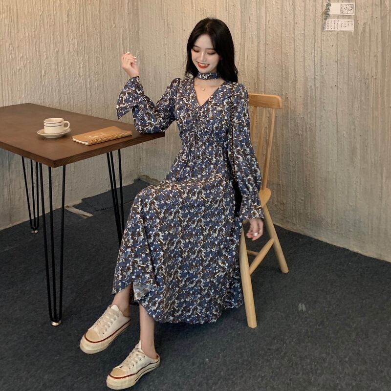 スカート スプリングスタンダードロングVネックドレス フローラル薄手Aライン レトロ 春物 花柄 試着室34765085779