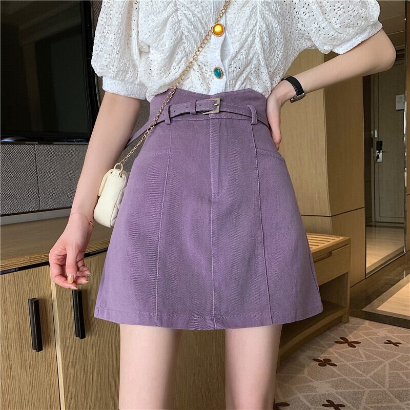 スカート サマーハイウェストウェスト薄手Aラインスタンダードショート レトロ 夏物 パープル 試着室13031372648