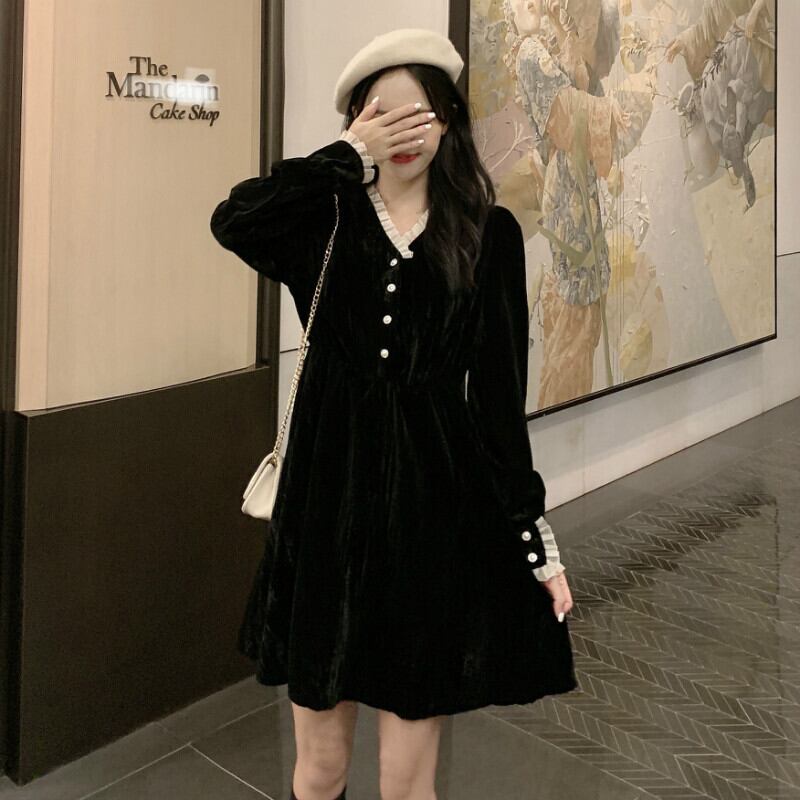 スカート スタンダードブラックベルベットロングドレス スプリングウェスト薄手 レトロ 春物 試着室42395384551