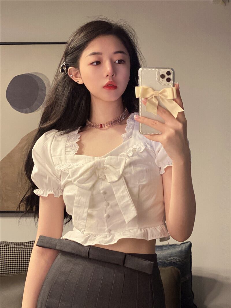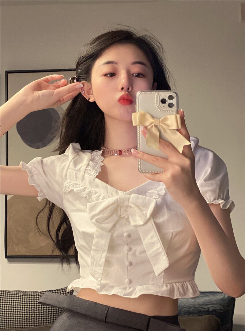 ホワイトシャツ サマーハイウェストウェストショートトップス リボン 大人ガーリー スウィート キュート カジュアル 夏物 試着室59116112751