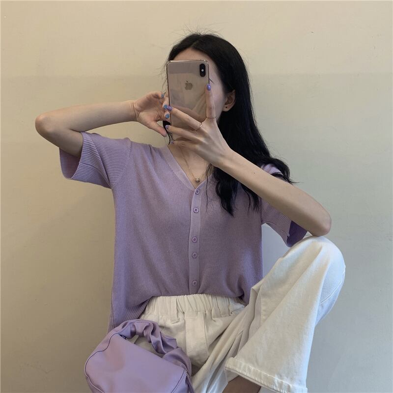 スタンダードクロップドトップス レディースサマーVネックブラックニットカーディガン レトロ 夏物 試着室54906653899