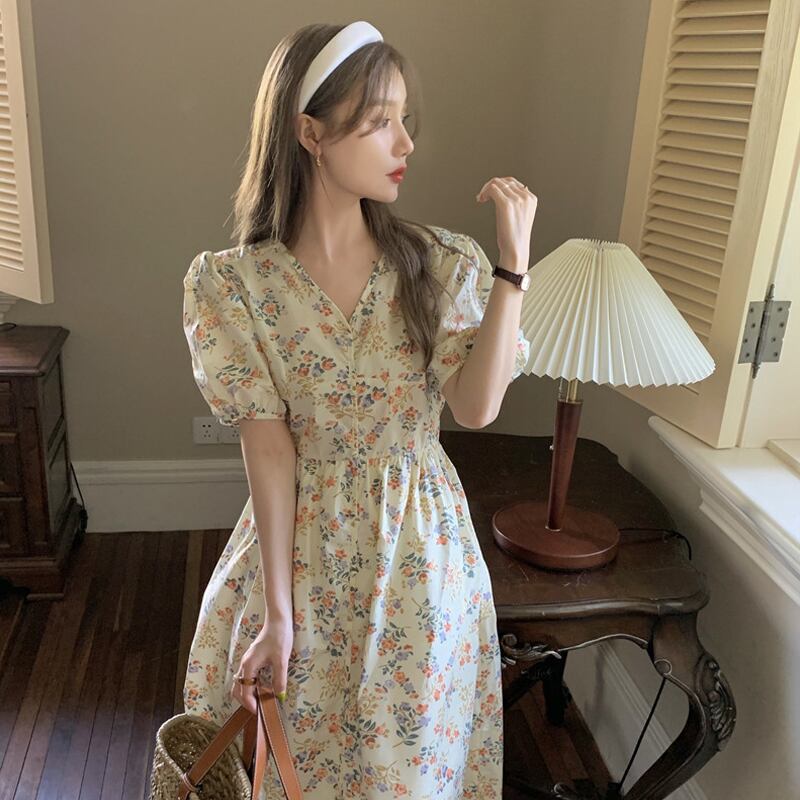 フローラルVネックドレス サマースタンダードスリーブロングスカート レトロ 夏物 花柄 試着室95445157636